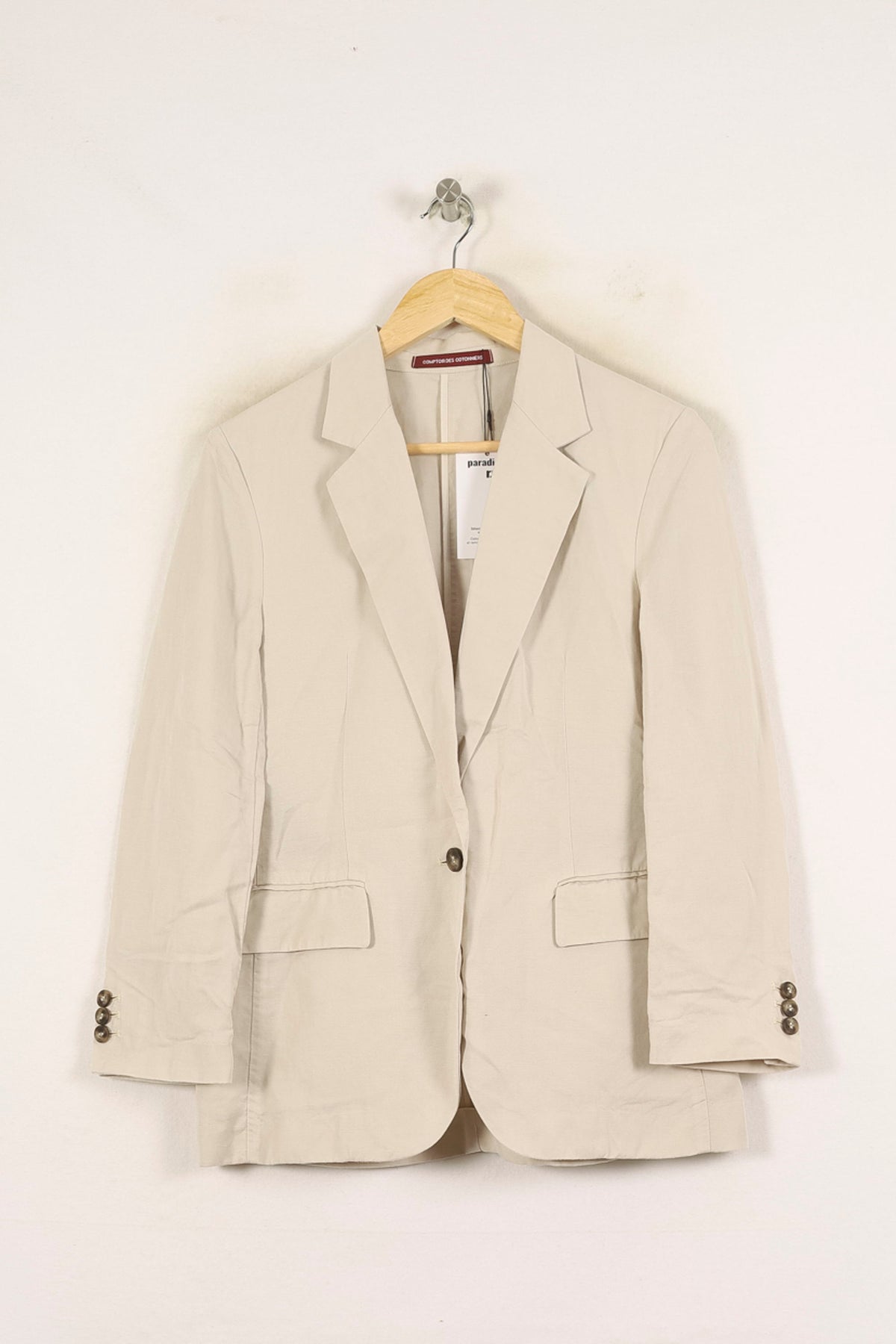 Veste beige Comptoir des Cotonniers en taille XS/34, idéale pour une silhouette élégante et épurée. Confectionnée dans une matière légère et structurée, cette veste se distingue par sa coupe droite, ses poches à rabat et ses boutons raffinés sur les manches, apportant une touche de sophistication discrète. Parfaite pour un entretien professionnel ou une réunion de travail, elle s'associe aisément à un pantalon habillé ou une jupe pour un look chic et intemporel.