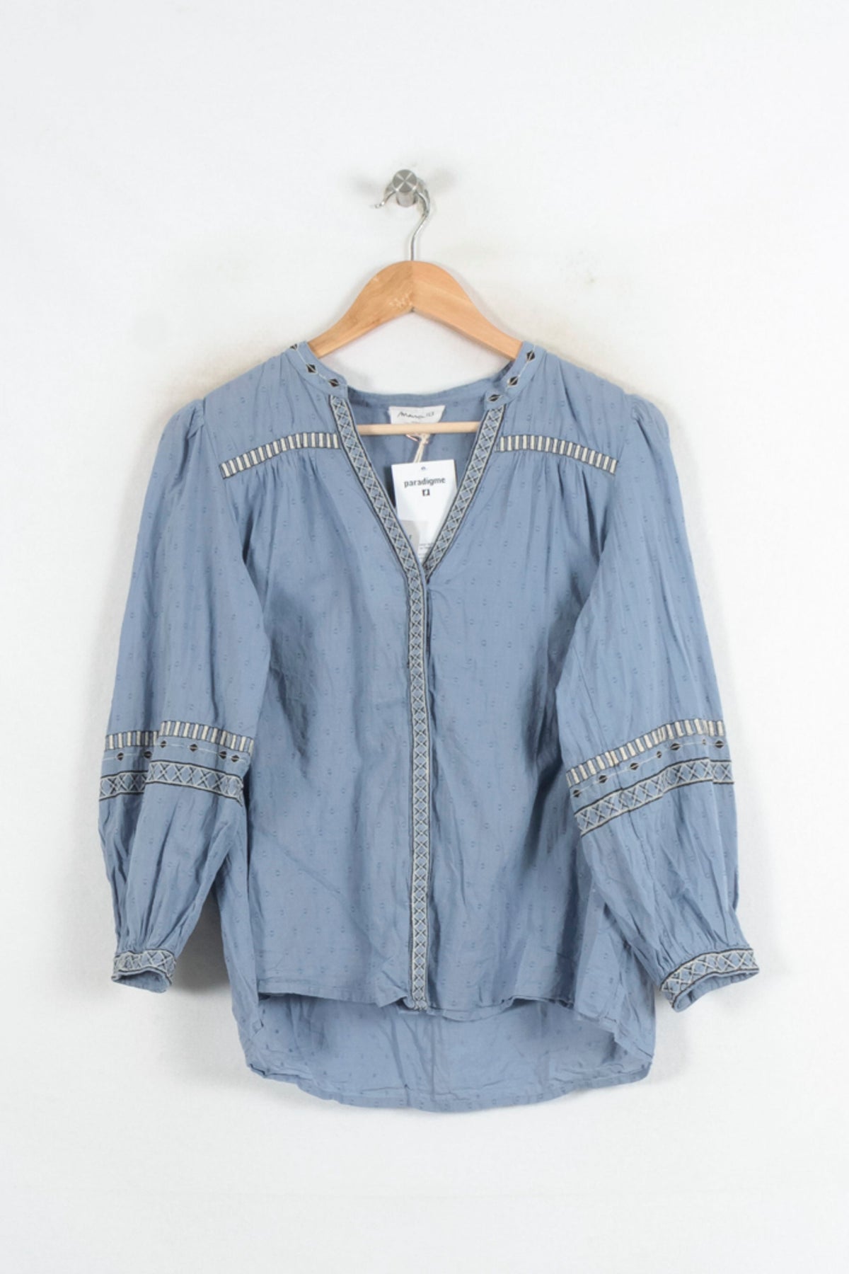 Blouse bohème bleue Maison 123, taille M/38, dotée de manches longues et d’un col tunisien orné de détails raffinés. Confectionnée dans une matière légère à motifs discrets, elle séduit par ses empiècements à broderies et œillets métalliques qui apportent une touche d’originalité à cette pièce unique. Idéale pour un déjeuner en ville ou une journée au bureau, elle s’accorde parfaitement avec un jean ou une jupe élégante.