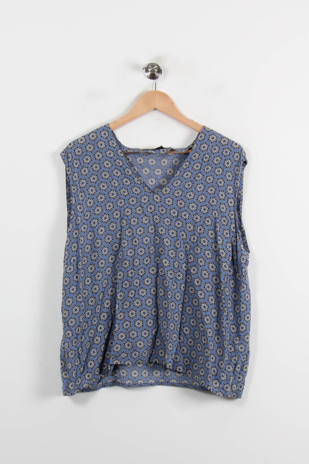 Top sans manches bleu à motifs géométriques, taille XXXL/46, La Fée Maraboutée. Ce haut en tissu léger séduit par son imprimé exclusif à répétition et son encolure en V, offrant une touche d’originalité raffinée à la silhouette. Idéal à porter lors d’une journée estivale ou pour une sortie décontractée entre amis.