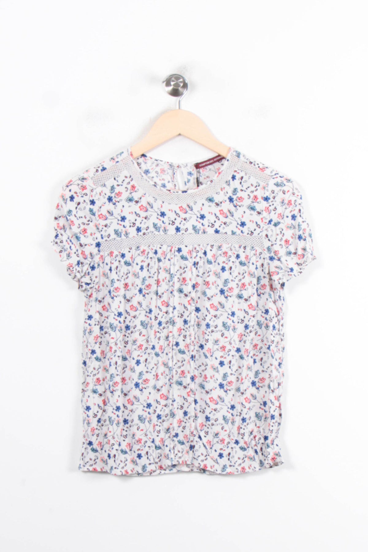 Top fleuri Comptoir des Cotonniers, taille S/36, multicolore, avec imprimé floral délicat. Confectionné dans une matière légère et fluide, ce haut se distingue par ses jeux de smocks et de fronces sur le buste et les manches courtes, lui apportant une touche romantique et raffinée. Idéal pour une journée décontractée ou un déjeuner estival en terrasse.