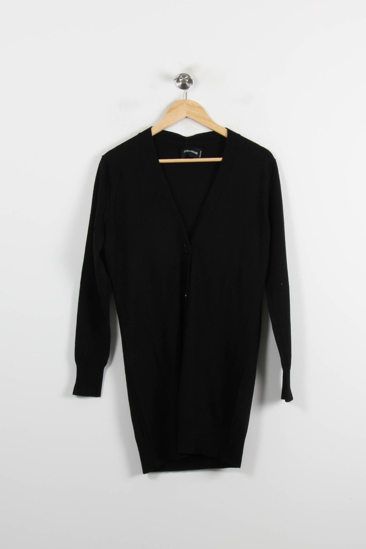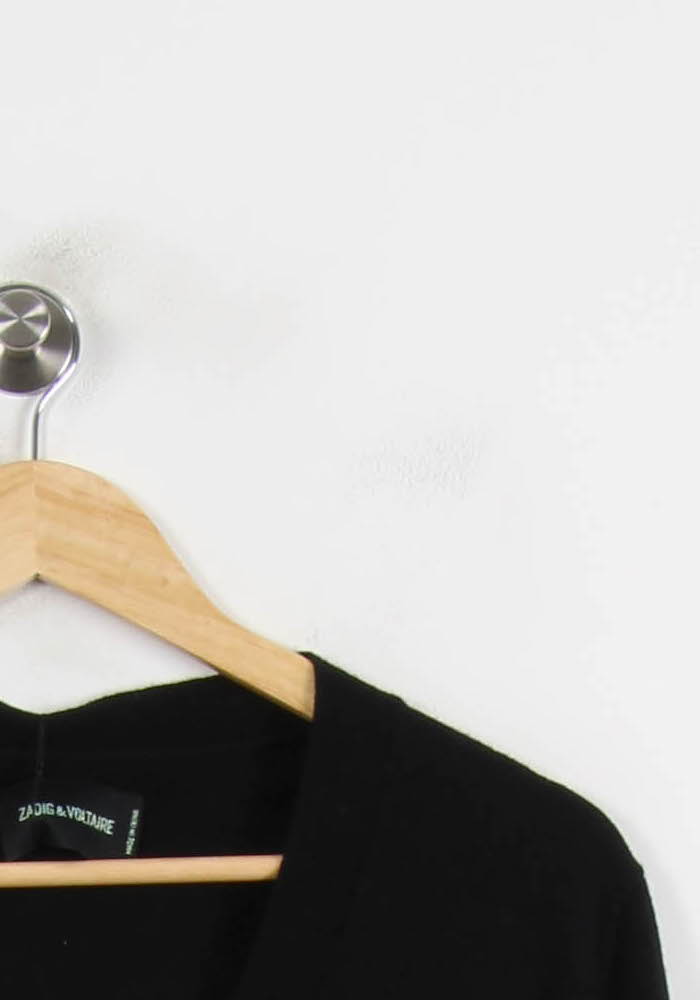 Cardigan noir Zadig&Voltaire, taille S/36, au design épuré et classique. Confectionné dans une maille fine, ce cardigan à fermeture boutonnée présente un col en V profond et de longues manches, assurant confort et élégance à toute tenue. Idéal pour une journée au bureau ou pour compléter un look casual chic lors d’une sortie citadine.