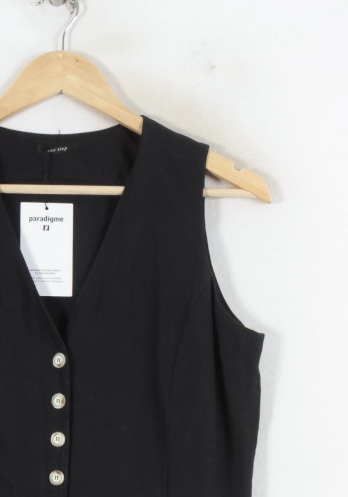 Combinaison sans manches One Step, taille L/40, de couleur bleu, dotée d’un élégant boutonnage central. Confectionnée dans une matière fluide et légère, cette pièce se distingue par son encolure en V et ses boutons contrastés qui apportent une touche sophistiquée à l’ensemble. Idéale pour un événement estival ou une journée élégante en ville.