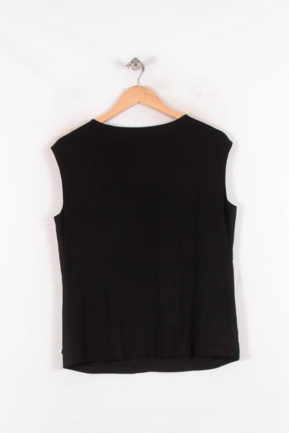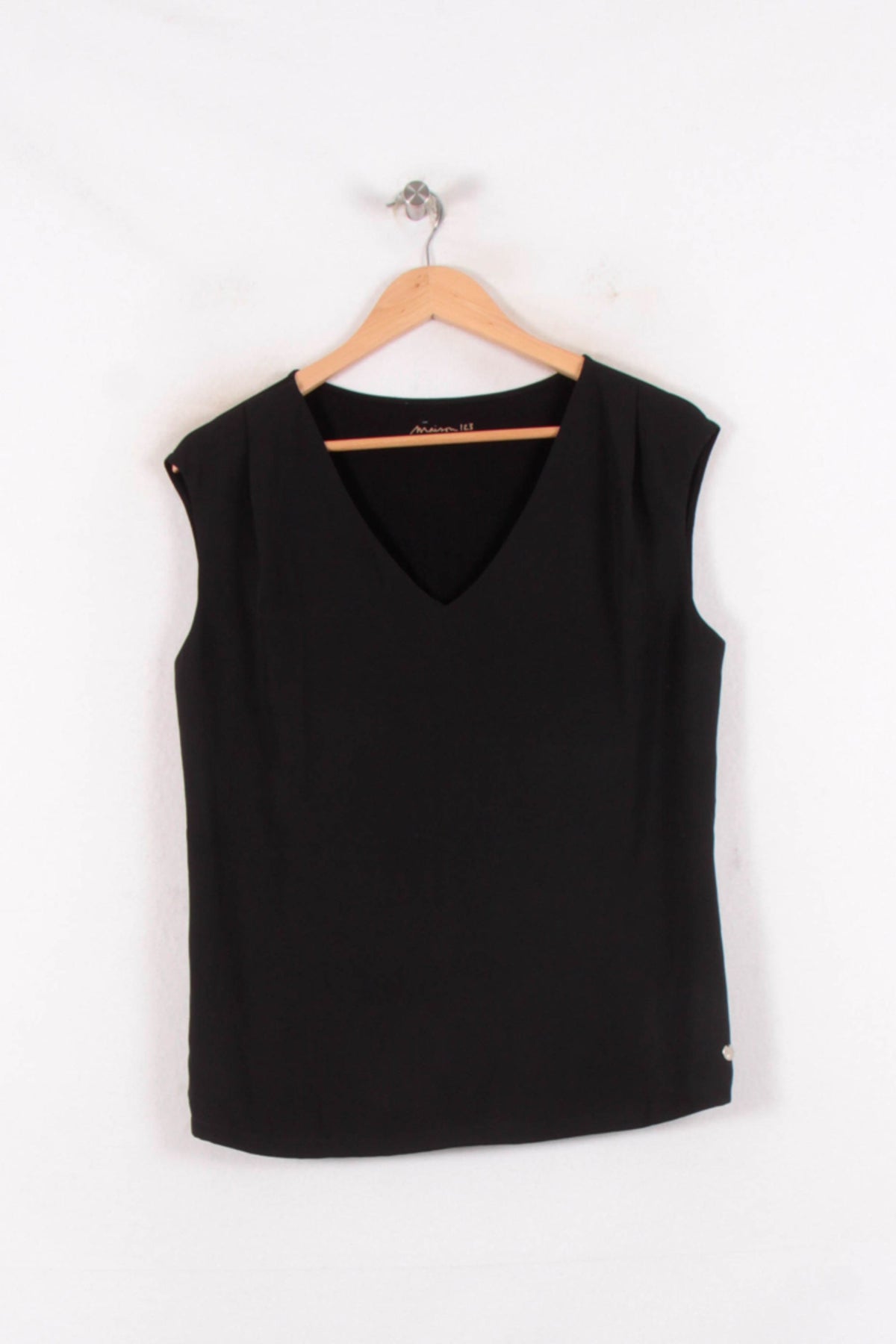 Top sans manches noir Maison 123, taille L/40, à encolure en V. Confectionné dans une matière fluide, ce haut se distingue par sa coupe épurée et ses finitions soignées, mettant en valeur une élégance intemporelle. Idéal pour une journée au bureau ou une soirée estivale, il s'adapte à toutes vos envies chic.