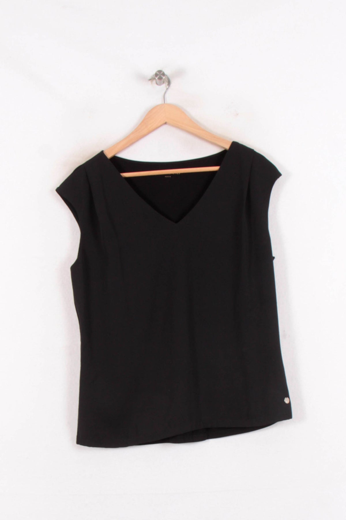 Top sans manches noir Maison 123, taille L/40, à l’encolure en V, idéal pour un look moderne et intemporel. La matière fluide offre une coupe élégante et confortable, tandis que le détail métallique discret à la base apporte une touche de raffinement. Parfait pour une journée au bureau accompagné d’un pantalon tailleur ou pour une sortie chic en soirée.