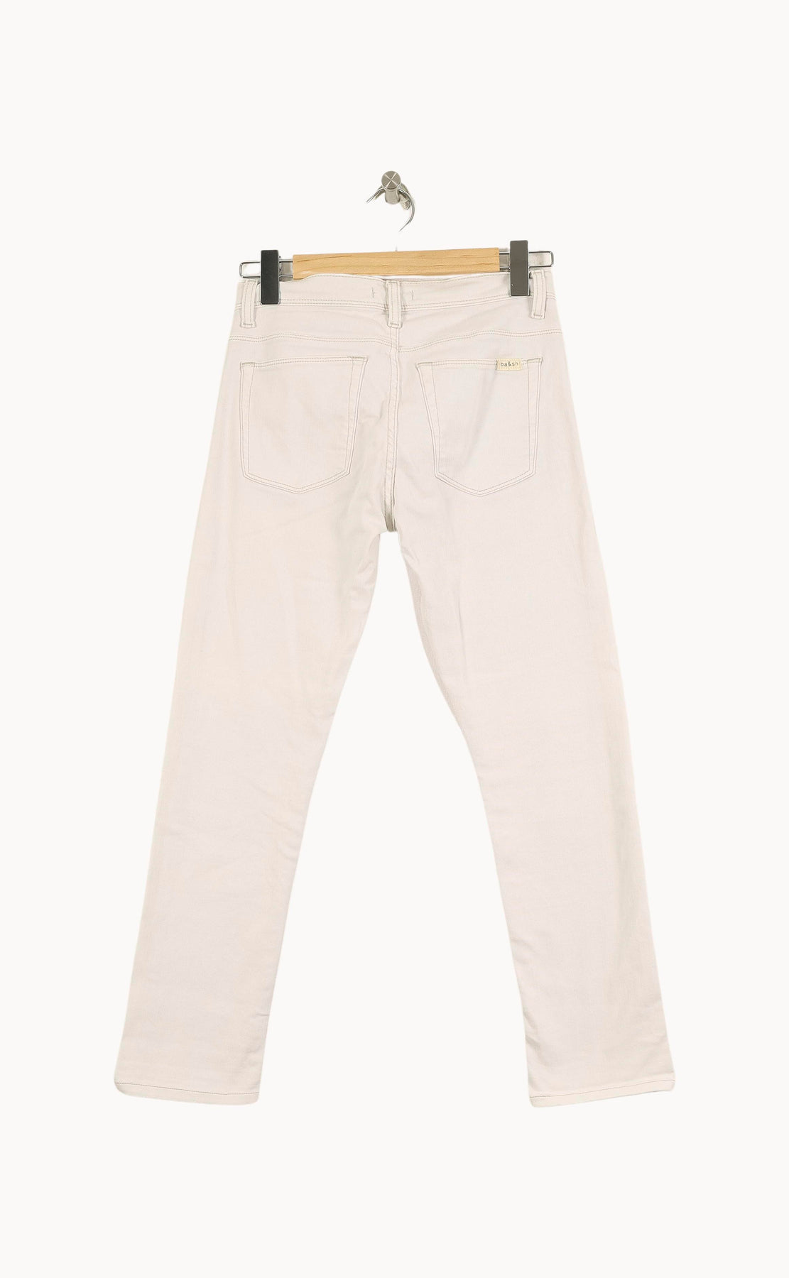 Jean beige ba&sh taille XS/34, coupe droite classique, idéal pour une silhouette élégante et décontractée. Confectionné dans une toile à la fois douce et résistante, ce pantalon offre une finition soignée avec cinq poches et des rivets métal discrets, pour un style intemporel souligné par des détails authentiques. Un choix parfait pour une journée citadine ou un déjeuner entre amis, à associer avec une chemise fluide ou un pull léger.