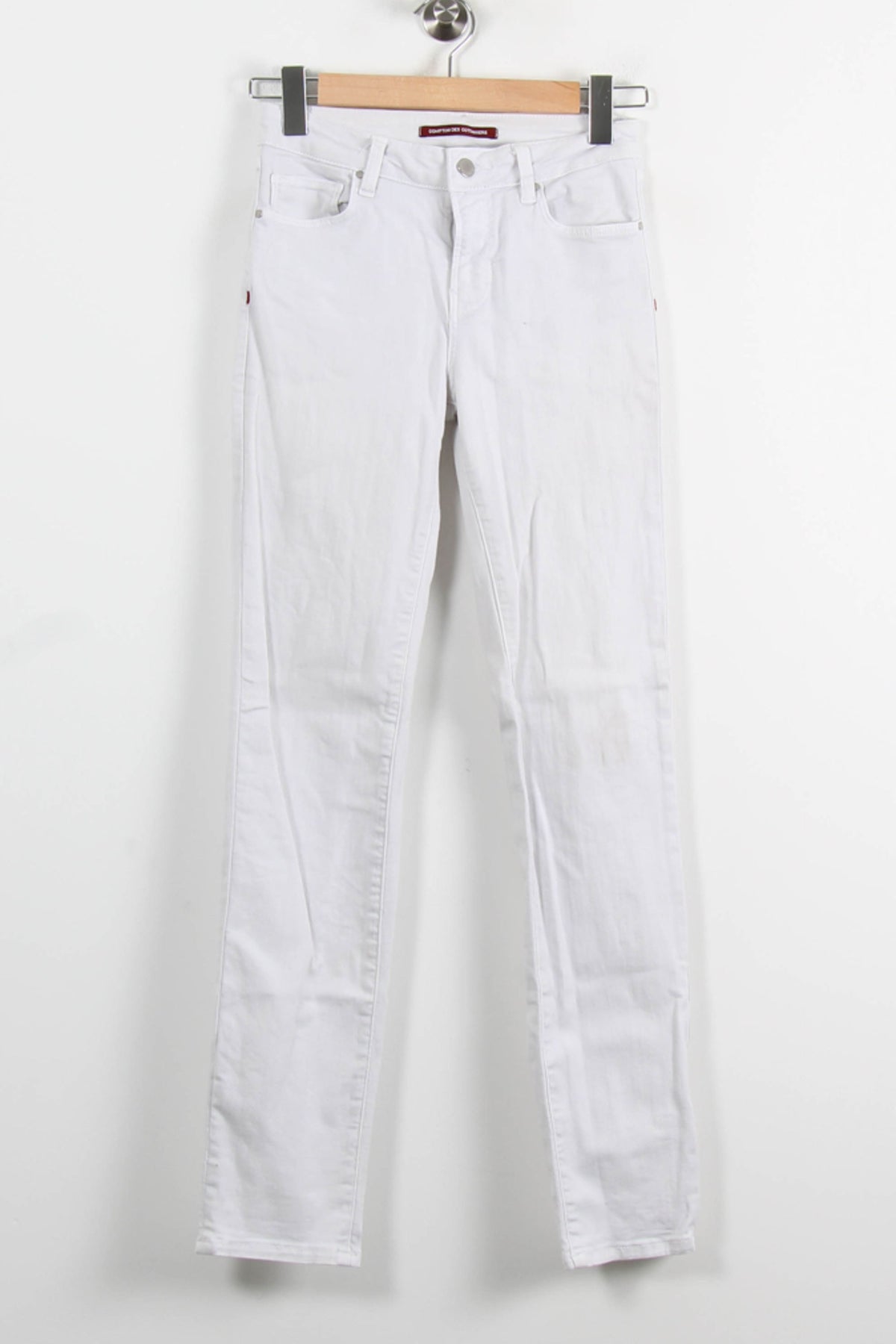 Pantalon blanc Comptoir des Cotonniers, taille XS/34, coupe ajustée, idéal pour un look frais et épuré. Confectionné dans une toile légère, ce pantalon présente une finition soignée avec cinq poches classiques et une fermeture à bouton métallique, accentuant la simplicité élégante de la pièce. Parfait pour une journée estivale en ville ou un brunch entre amis accompagné d’une chemise fluide.