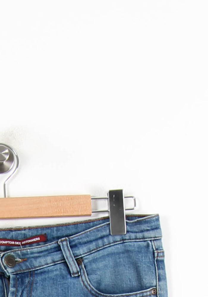 Jean bleu Comptoir des Cotonniers, taille L/40, coupe droite classique et allure intemporelle. Confectionné dans une toile de denim bleu, ce pantalon présente des finitions soignées avec cinq poches et des surpiqûres discrètes qui soulignent sa sobriété et sa qualité. Idéal pour composer une tenue élégante et décontractée au quotidien, aussi bien pour une journée au bureau qu’une sortie entre amis.