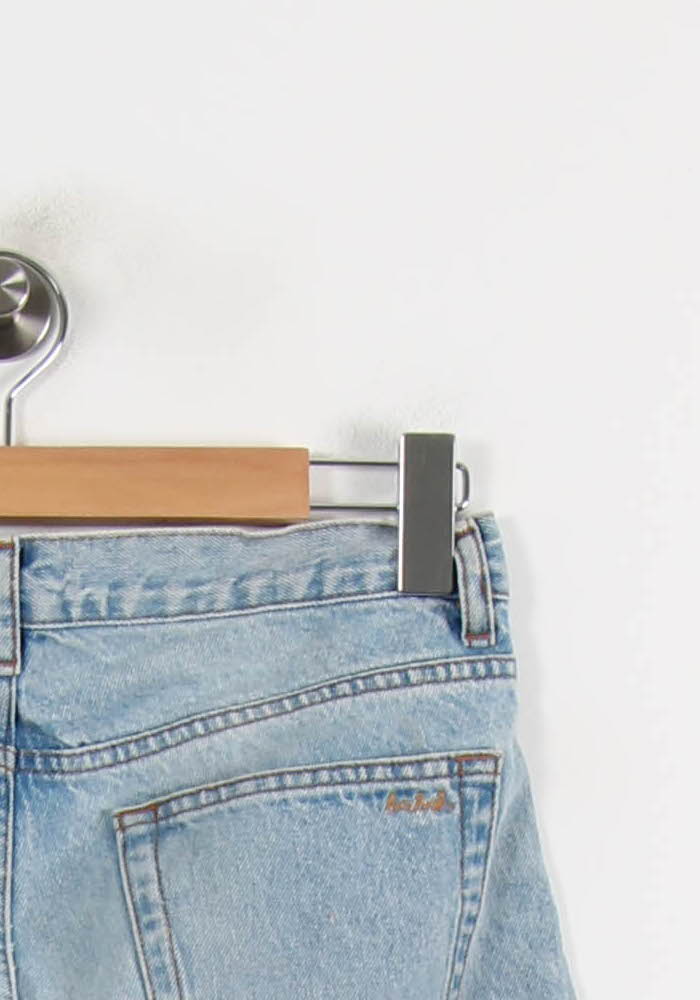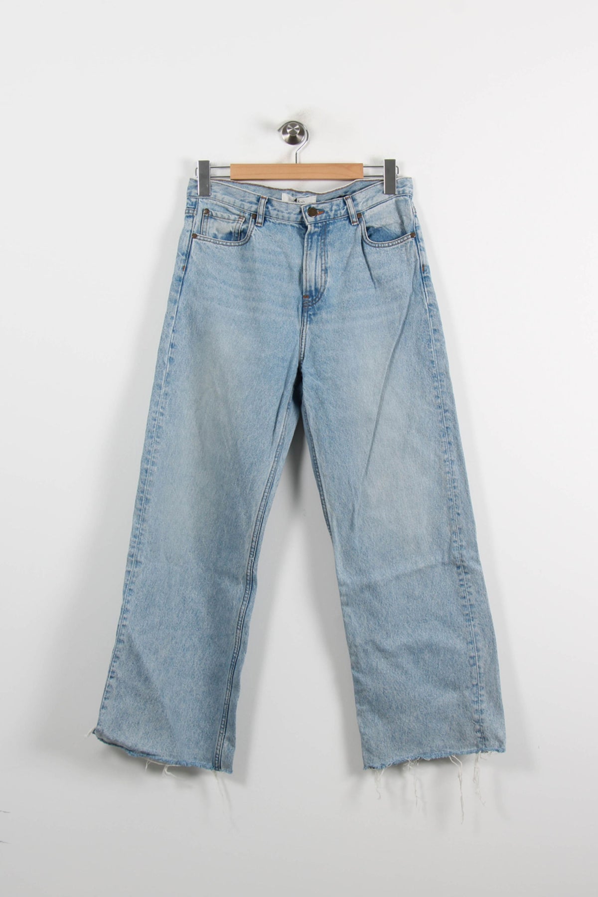 Jean bleu ba&sh, taille L/40, coupe droite au style décontracté et allure moderne. Confectionné dans un denim bleu clair, ce pantalon se distingue par sa matière robuste et confortable, ses finitions brutes au bas des jambes et ses deux poches plaquées à l’arrière, offrant un caractère authentique et contemporain. Idéal pour une sortie urbaine ou un week-end détente, associé à un pull ou un tee-shirt pour un look casual.