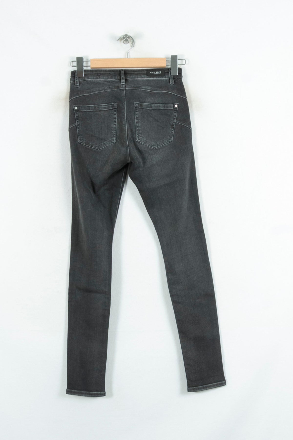 Jean slim gris One Step, taille XS/34, idéal pour une allure moderne et tendance. Ce pantalon présente une matière denim souple et légèrement délavée, avec des détails métalliques sur les poches avant qui lui confèrent une touche d’originalité. Parfait pour une journée de travail décontractée ou une sortie citadine, il s'adapte facilement à de nombreuses tenues.