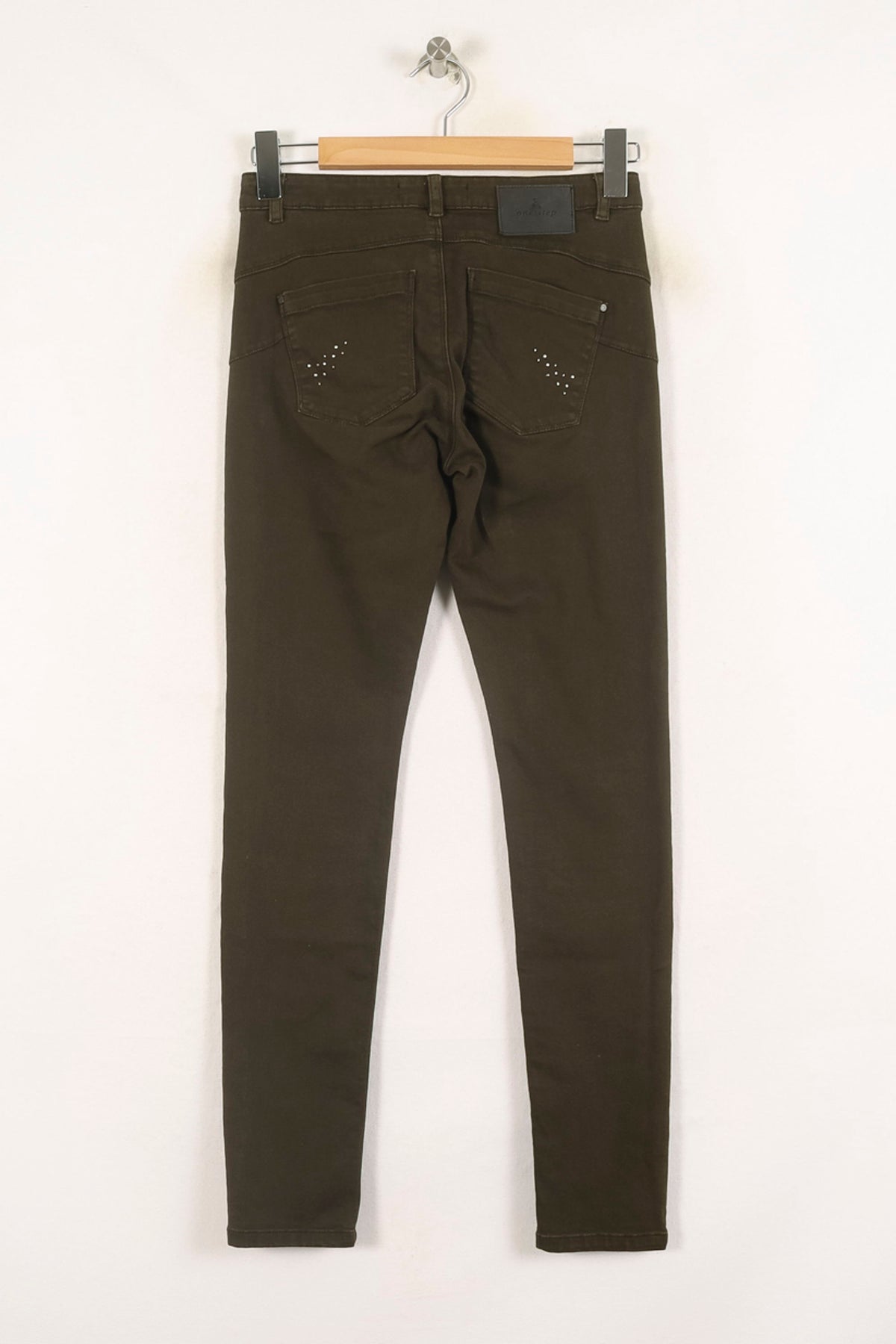 Pantalon slim vert One Step, taille XS/34, coupe moderne parfaite pour une silhouette élégante. Confectionné dans une toile souple et confortable, ce pantalon est agrémenté de petits rivets métalliques discrets sur les poches avant qui lui confèrent une touche raffinée et originale. Idéal pour une journée de travail ou un dîner décontracté, il s’adapte facilement à toutes vos envies.