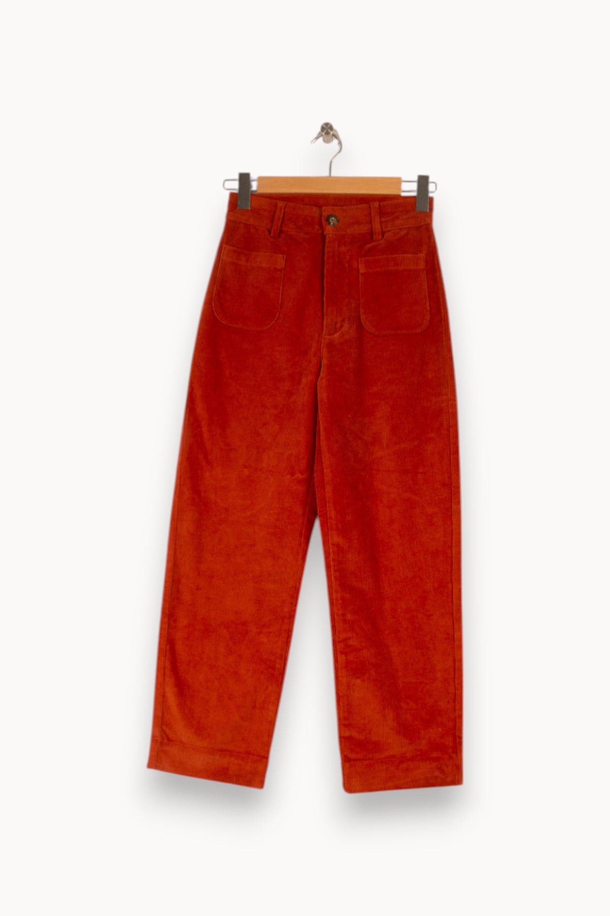 Pantalon large bordeaux en velours côtelé Petite Mendigote, taille S/36. Ce pantalon séduit par sa matière en velours doux et texturé, ses larges poches plaquées sur le devant et sa coupe droite qui lui confèrent une allure rétro et raffinée. Idéal pour une journée au bureau ou un déjeuner en ville, il apporte une touche d'élégance décontractée à votre tenue.