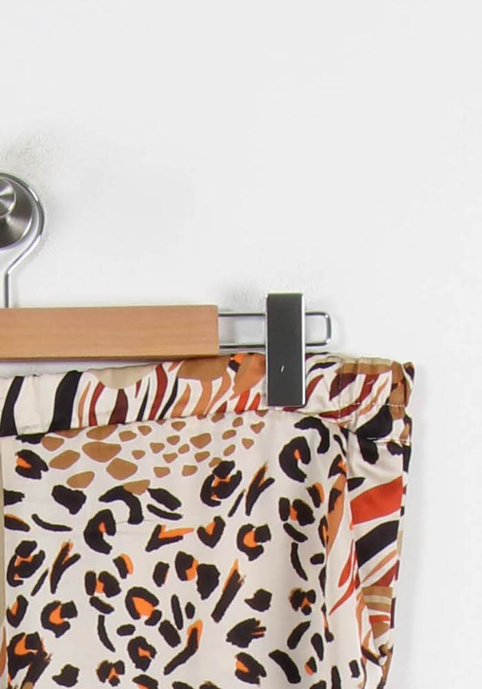 Pantalon ample multicolore Liu Jo, taille XXL/44, arborant un motif animalier audacieux et dynamique. Confectionné dans une matière fluide à l’aspect légèrement satiné, il se distingue par une impression multicolore mêlant des nuances naturelles et des accents orangés, offrant une touche unique et sophistiquée. Ce pantalon sera parfait pour une soirée estivale ou une occasion décontractée chic, apportant élégance et originalité à votre tenue.