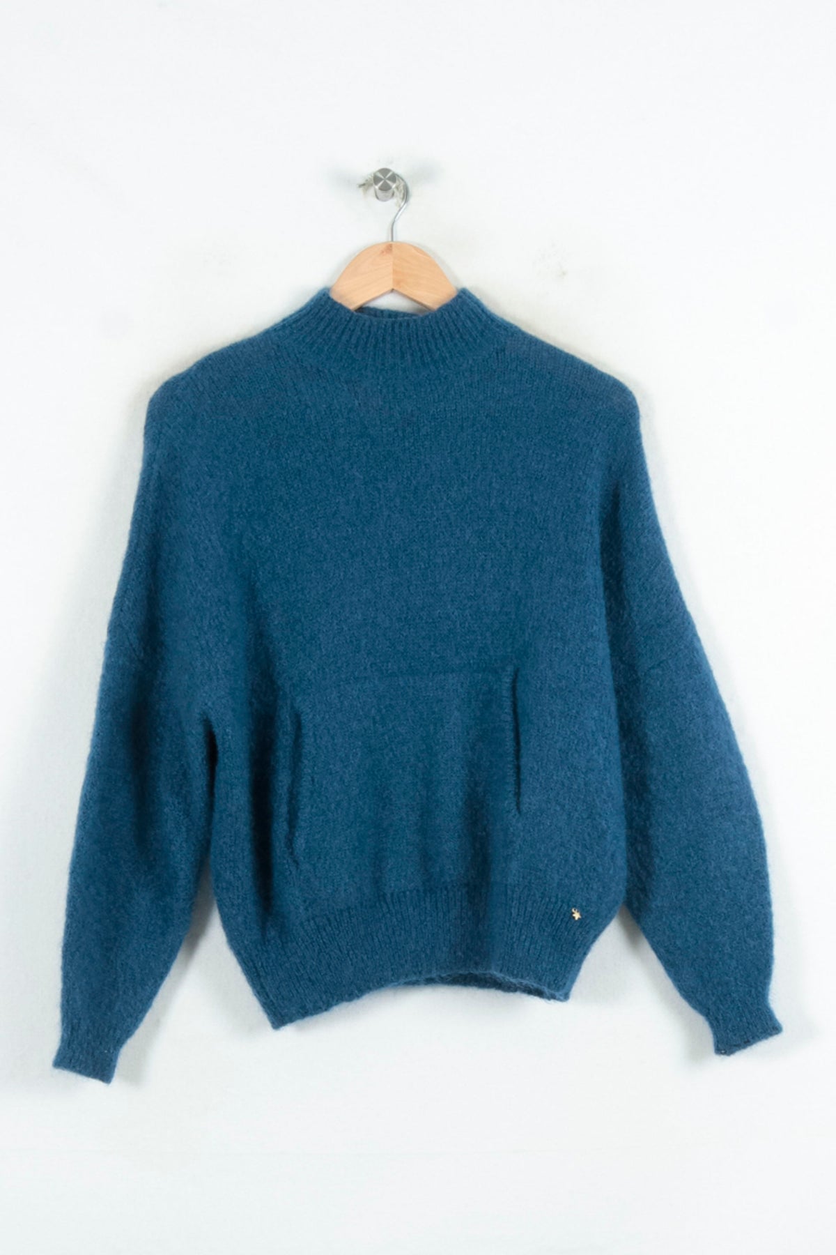 Pull bleu col montant Des Petits Hauts, taille S/36, parfait pour la saison froide. Tricoté dans une maille duveteuse, il se distingue par sa texture douce et son col légèrement montant, ainsi que par un petit détail doré discret. Idéal pour un look raffiné et cosy lors d’une sortie hivernale ou d’une journée au bureau.