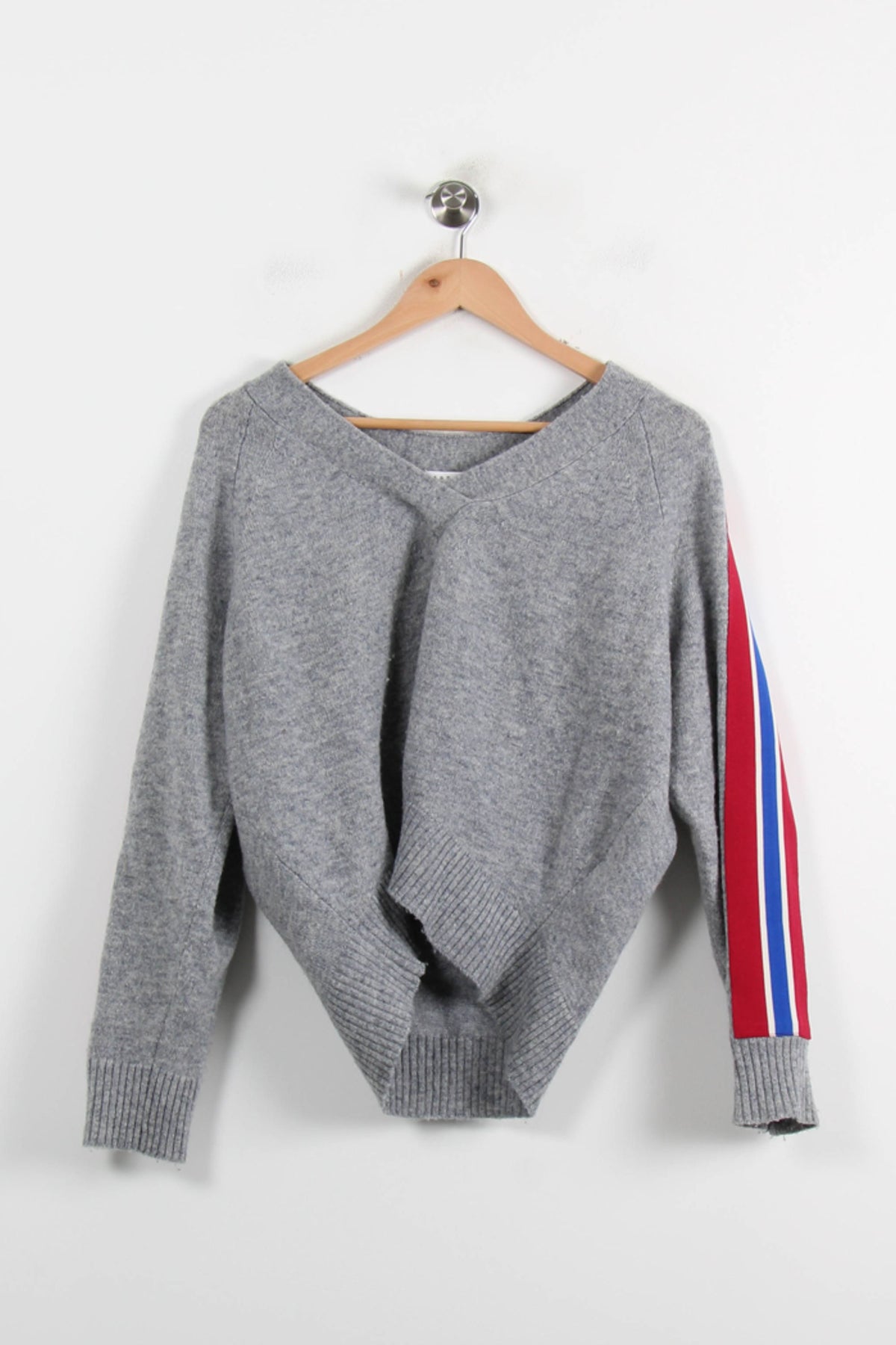 Pull gris Sandro taille M/38, confectionné dans une maille douce, avec détail rayé tricolore sur la manche. La matière semble épaisse et confortable, tandis que l’encolure en V et les bandes bleu-blanc-rouge sur la manche apportent une touche d'originalité à ce modèle. Idéal pour un look casual chic lors d’un déjeuner en ville ou une sortie entre amis.
