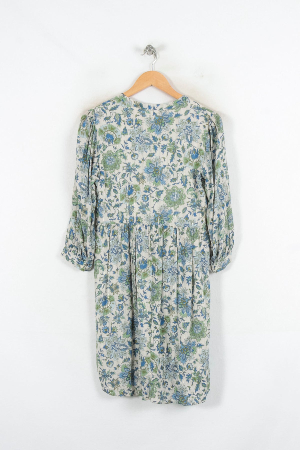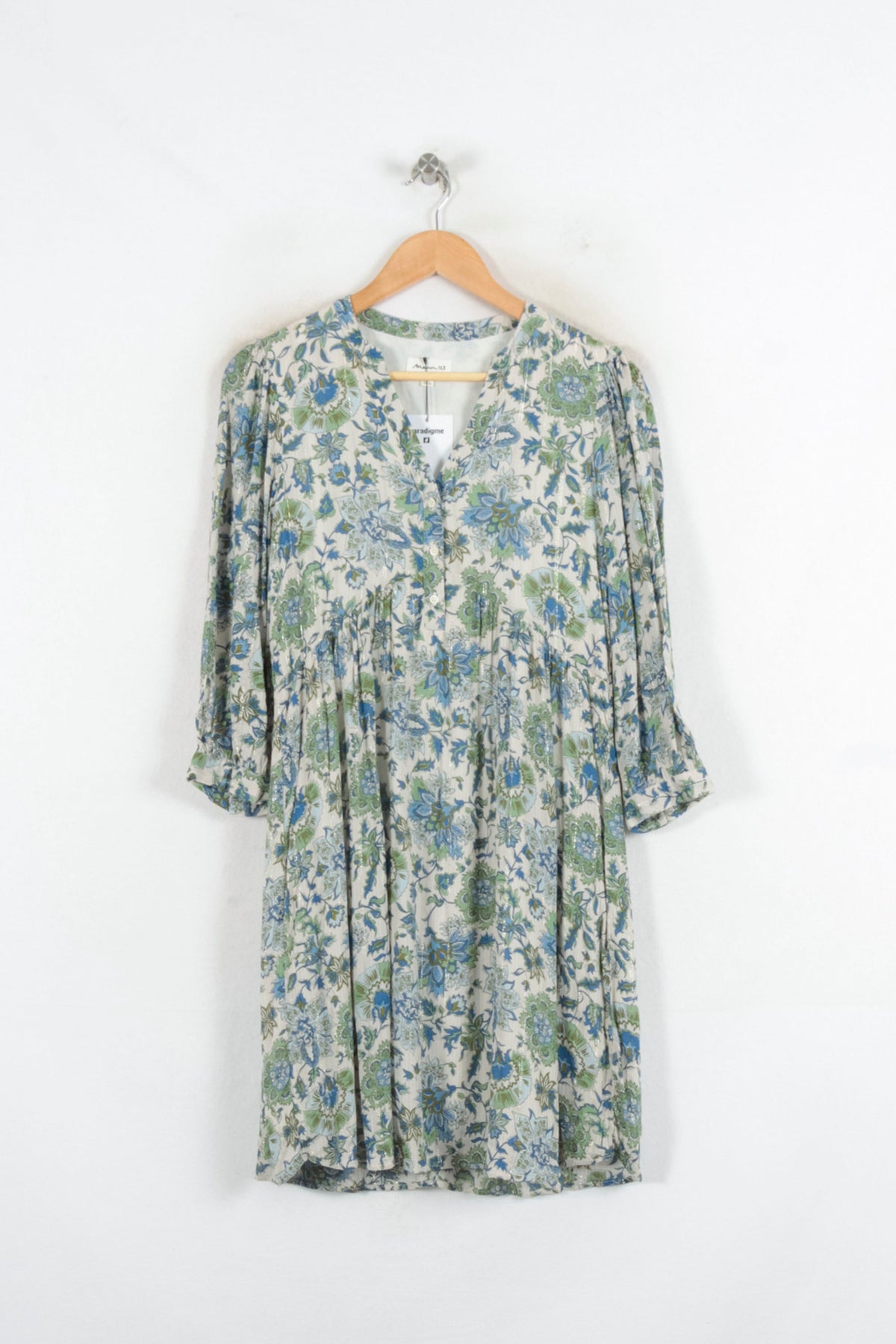 Robe courte multicolore Maison 123, taille XS/34, à imprimé floral vert et bleu. Réalisée dans une matière fluide et légère, cette robe dispose de manches trois-quarts légèrement froncées et d’un col en V, mettant en valeur ses motifs délicats et raffinés pour une allure féminine et intemporelle. Parfaitement adaptée pour une sortie printanière ou un déjeuner en terrasse entre amis.