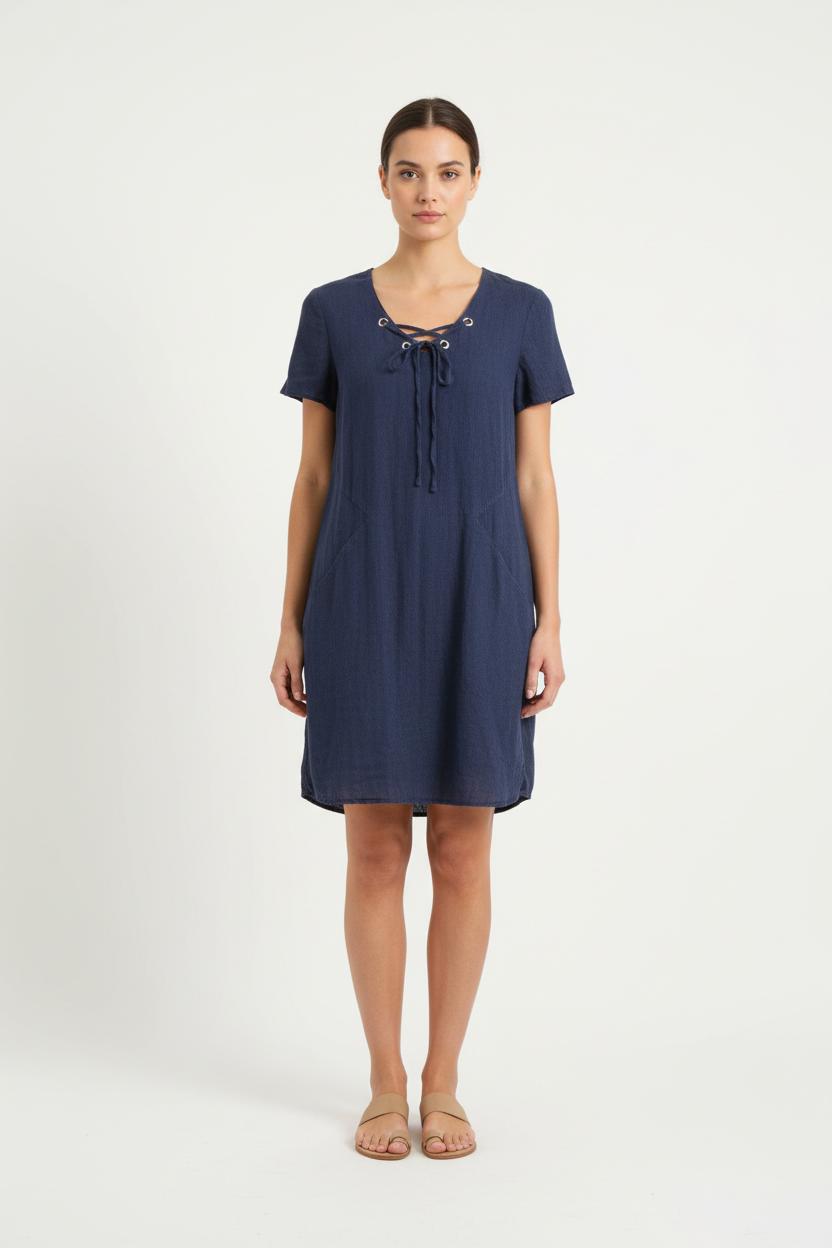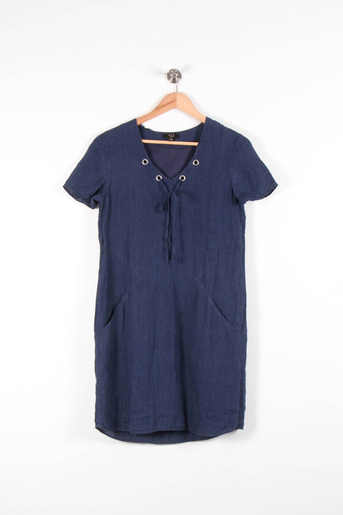 Robe bleu marine à manches courtes Maison 123, taille S/36, au style épuré et moderne. Confectionnée dans une matière fluide et légèrement texturée, cette robe présente un laçage élégant à l’encolure agrémenté d’œillets métalliques, ainsi que deux poches latérales discrètes pour une touche pratique. Parfaite pour une journée au bureau ou un déjeuner en ville, elle allie confort et raffinement en toute simplicité.