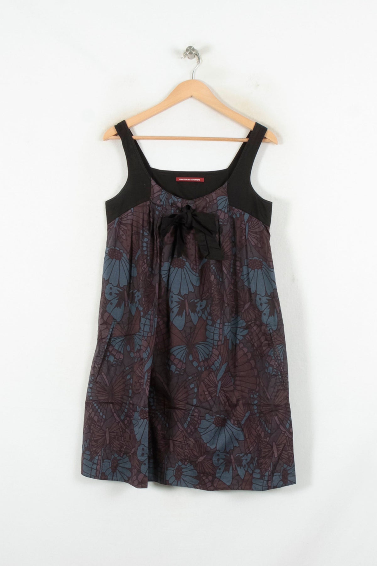 Robe courte multicolore Comptoir des Cotonniers, taille S/36, avec bretelles larges et nœud décoratif sur le devant. La matière légère laisse apparaître un motif floral et papillons dans des tons bleu et bordeaux, rehaussée par des empiècements unis noirs sur le haut qui lui confèrent une touche élégante et originale. Idéale pour un déjeuner entre amis ou une sortie estivale en ville.