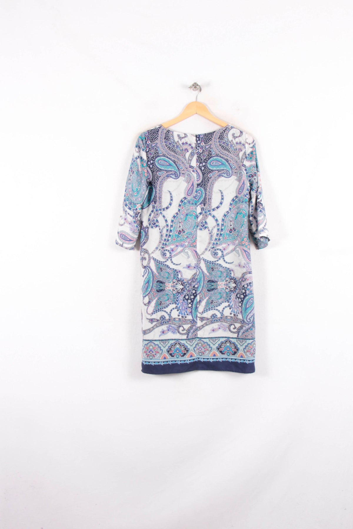 Robe droite multicolore Maison 123, taille M/38, au motif cachemire élégant et raffiné. Confectionnée dans une matière fluide et légère, elle séduit par ses imprimés cachemire délicats et ses détails de bordure contrastée au bas de la robe apportant une touche d’originalité. Idéale pour une sortie estivale ou un déjeuner élégant entre amis.