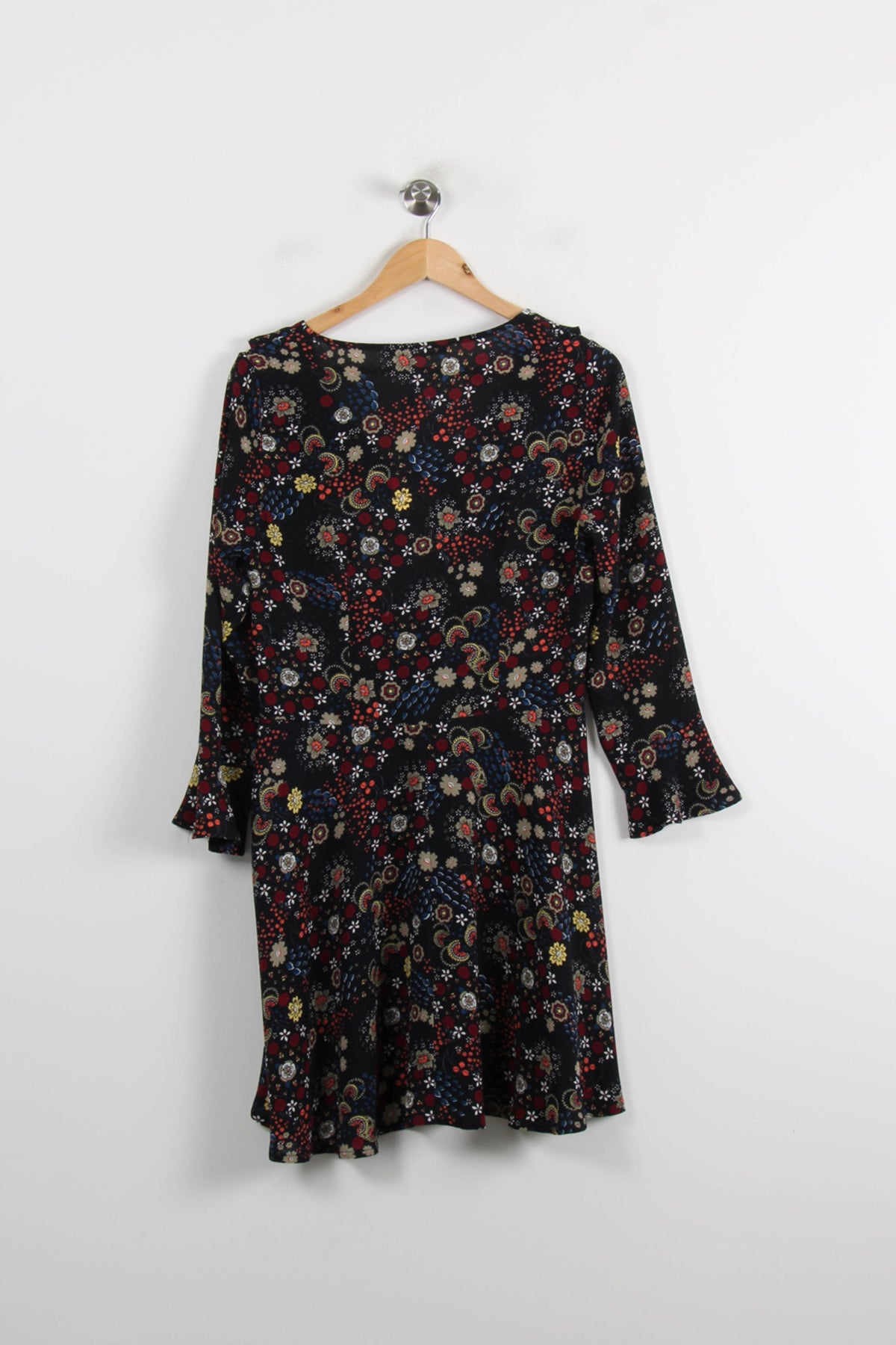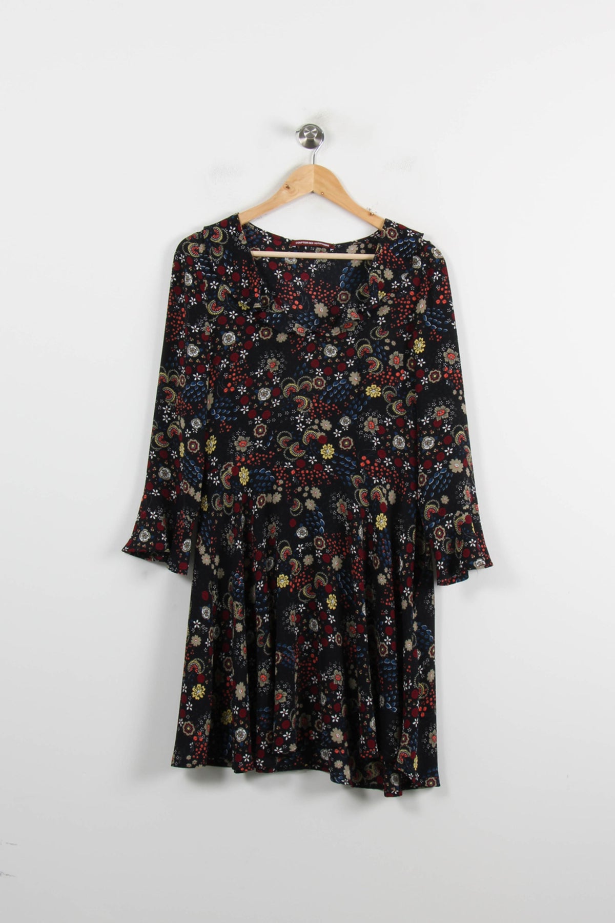 Robe multicolore Comptoir des Cotonniers, taille M/38, à motifs fleuris sur fond foncé, coupe fluide et manches longues légèrement évasées. Confectionnée dans une matière légère, elle se distingue par son imprimé floral raffiné et sa coupe féminine qui apporte une allure élégante et décontractée. Idéale pour une sortie printanière, un brunch ou une promenade en ville.