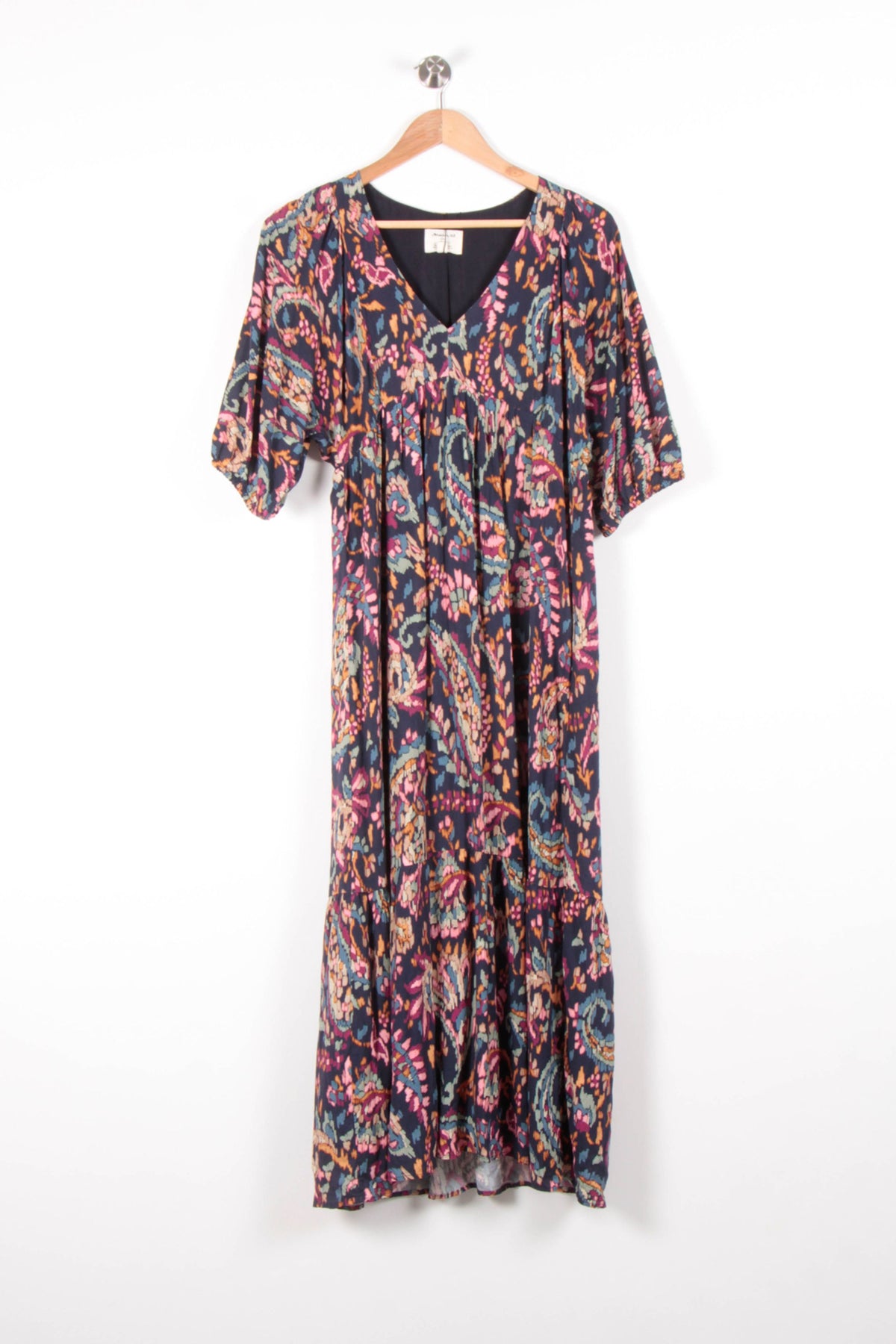 Robe multicolore fluide Maison 123, taille M/38 – une pièce élégante à l’imprimé dynamique pour sublimer toutes les silhouettes. Confectionnée dans une matière légère, cette robe se distingue par ses manches courtes amples et son encolure en V, ainsi que par son imprimé coloré aux motifs raffinés, qui apportent une touche unique et vibrante à votre garde-robe. Idéale pour une journée estivale, un brunch entre amis ou une sortie en ville, cette robe assure confort et style en toute circonstance.