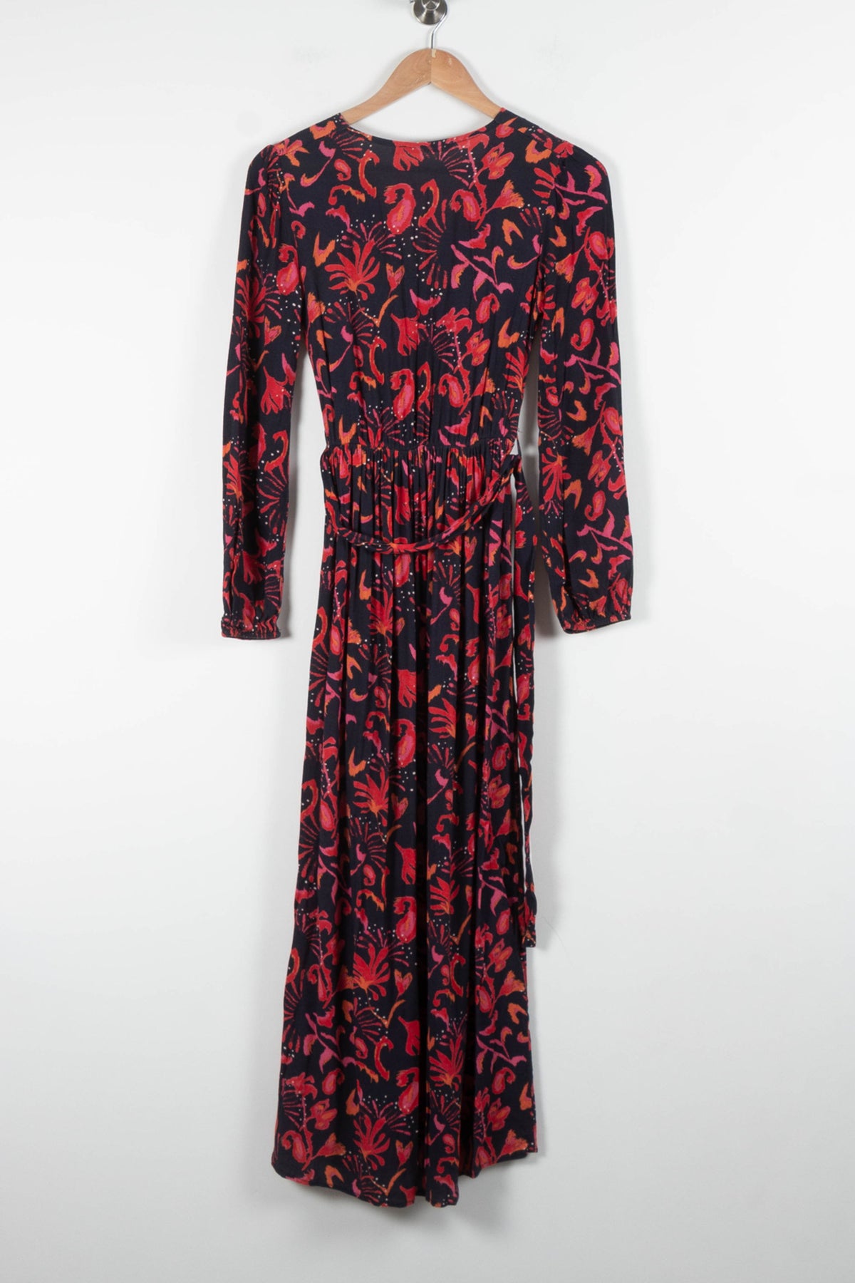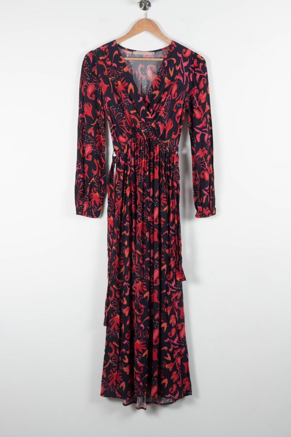 Robe longue multicolore à motifs abstraits, La Fée Maraboutée, taille XS/34. Confectionnée dans un tissu fluide et léger, cette robe se distingue par son encolure cache-cœur, sa taille froncée et ses manches longues, offrant une silhouette élégante et féminine. Idéale pour une soirée habillée ou un événement spécial, elle apporte une touche d’originalité et de sophistication à votre tenue.