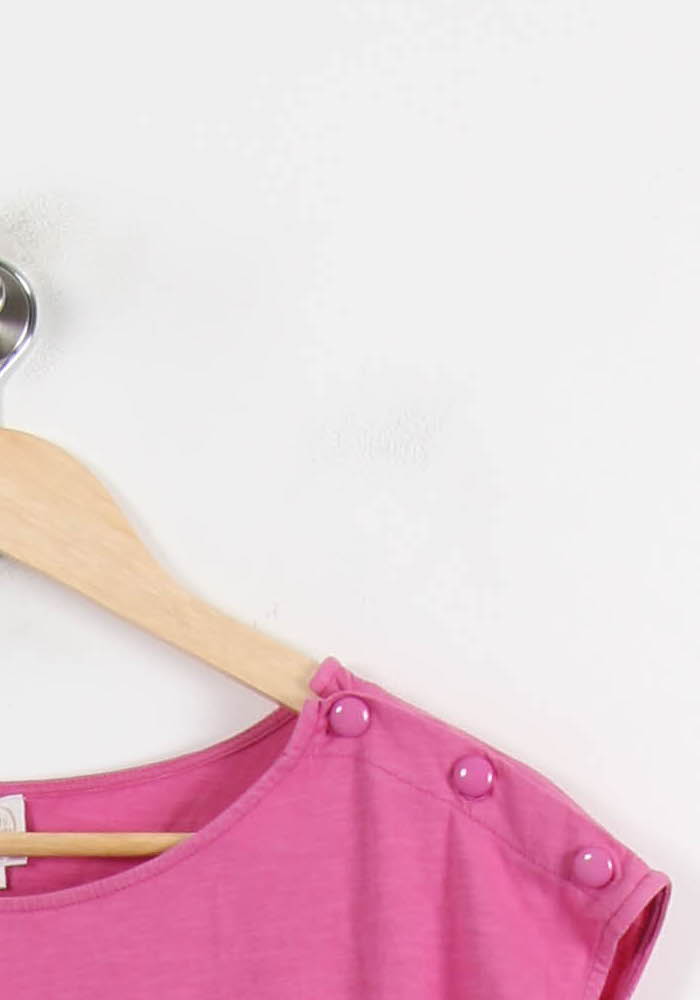 Robe rose Des Petits Hauts, taille L/40, à la coupe droite et ceinturée à la taille pour une allure décontractée et féminine. Confectionnée dans une matière légère et fluide, elle se distingue par ses boutons-pression à l’épaule et son lien ajustable, qui lui apportent une touche moderne et originale. Idéale pour une promenade estivale ou une journée détente en ville.