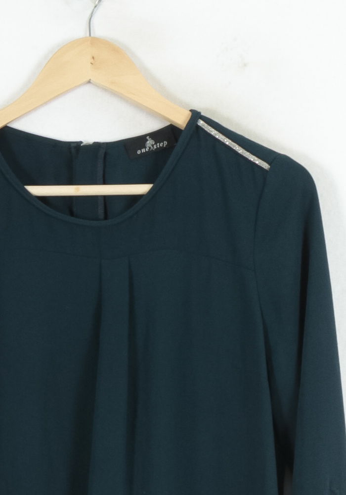 Robe bleu One Step, taille L/40, à manches longues et col rond. Confectionnée dans une matière fluide et légère, cette robe se distingue par ses plis subtils à l’avant et ses détails discrets sur les épaules qui lui confèrent allure et raffinement. Idéale pour une journée de travail ou une soirée élégante, elle s’adapte à toutes les occasions nécessitant une tenue chic et confortable.