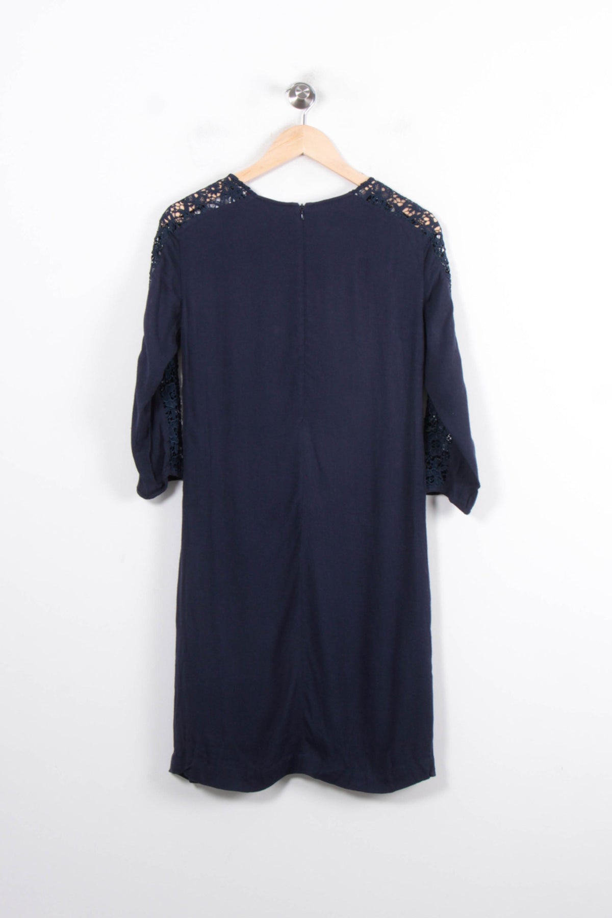 Robe bleu Comptoir des Cotonniers, taille S/36, élégante et féminine avec des manches trois-quarts ornées de dentelle florale ajourée. La matière fluide et douce du corps de la robe offre un grand confort, tandis que les détails en dentelle raffinée sur les épaules et les manches apportent une touche de sophistication unique. Parfaite pour un cocktail ou une soirée élégante, cette robe saura vous distinguer en toute discrétion.