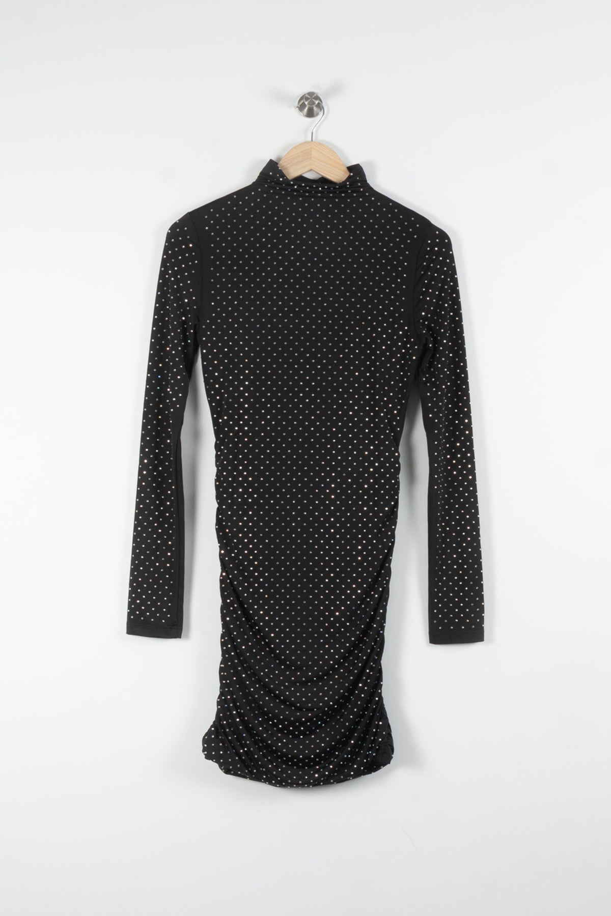 Robe noire Maje à manches longues, ornée de petits pois, taille S/36 – élégance intemporelle et coupe ajustée. Confectionnée dans une matière souple ornée de délicats motifs à pois, elle se distingue par ses fronces discrètes sur les côtés, mettant en valeur la silhouette et offrant un charme sophistiqué. Idéale pour une soirée ou un événement habillé, cette robe saura sublimer votre allure en toute occasion raffinée.