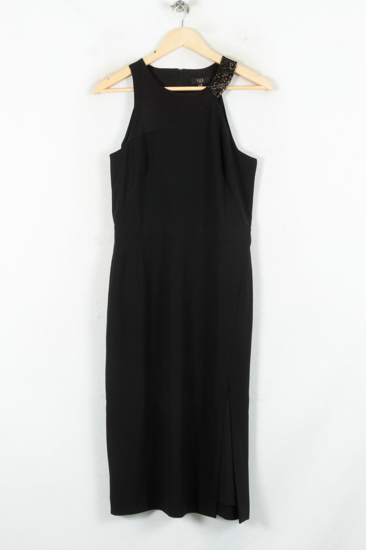 Robe noire Maison 123, taille M/38, modèle élégant à épaules dégagées, idéale pour une allure sophistiquée. Confectionnée dans une matière fluide, elle se distingue par son détail pailleté sur l’une des bretelles et sa coupe droite fendue, apportant une touche raffinée et originale. Parfaite pour une soirée habillée ou un événement formel.