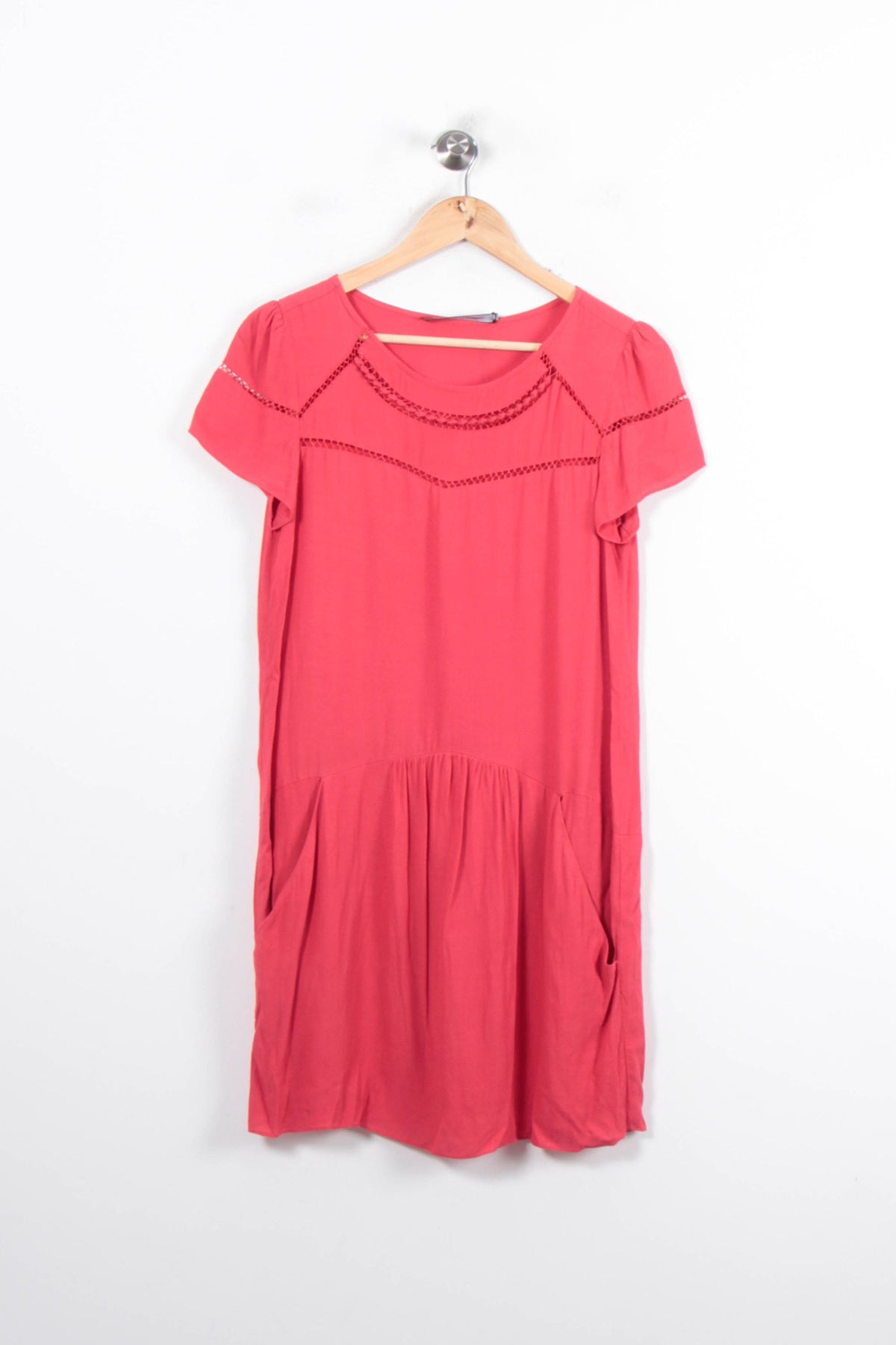 Robe rose Comptoir des Cotonniers, taille S/36, à manches courtes et coupe fluide. Confectionnée dans une matière légère, elle se distingue par ses délicates finitions ajourées à l’empiècement, apportant une touche raffinée et féminine. Parfaite pour une journée estivale élégante ou un brunch décontracté entre amis.