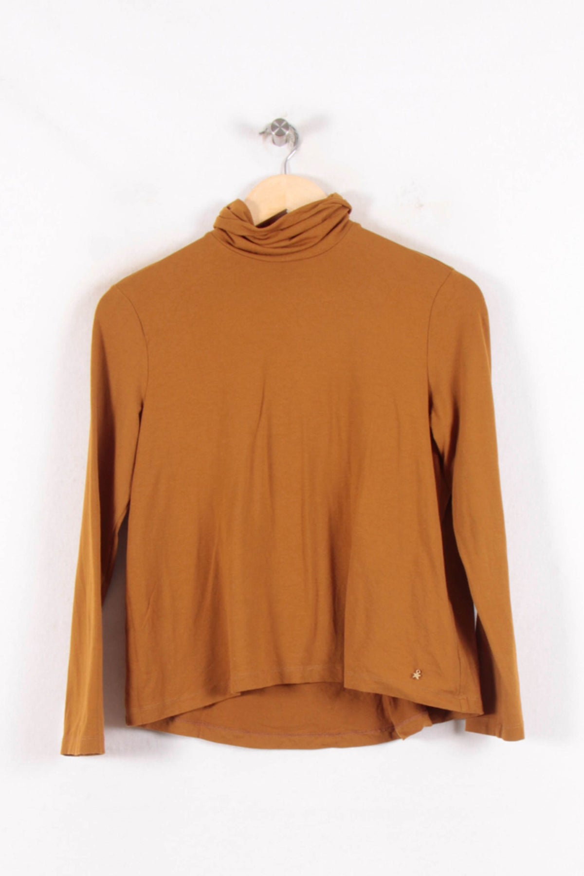 Pull col roulé jaune Des Petits Hauts, taille XS/34, au design épuré et élégant. Confectionné dans une matière douce, ce pull se distingue par son col roulé délicatement drapé et sa coupe fluide, avec comme détail discret un petit emblème brodé près de l’ourlet. Idéal pour une journée de travail ou une sortie décontractée, il apporte une touche lumineuse et raffinée à toutes vos tenues.