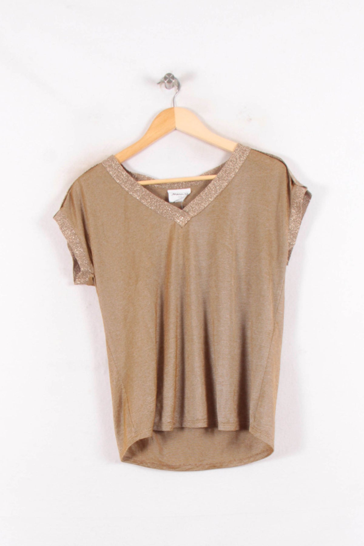 Top marron Maison 123, taille M/38, à col V orné de détails brillants. Ce haut présente une matière fluide et légère, mise en valeur par des finitions scintillantes autour de l’encolure et des manches, qui lui confèrent une touche élégante et sophistiquée. Idéal pour un déjeuner entre amis ou une sortie citadine, il apportera une note chic à votre tenue.