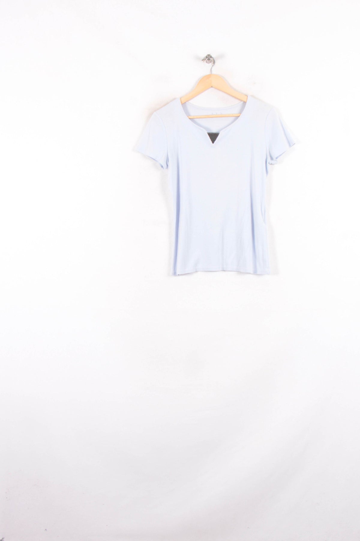 Top bleu Maison 123 en taille L/40, à manches courtes, au design épuré et élégant. Confectionné dans une matière douce et fluide, ce top se distingue par son col légèrement échancré et un subtil détail triangulaire sur le devant, apportant une touche de modernité discrète. Idéal pour une journée au bureau ou un déjeuner entre amis, il se marie aisément avec un pantalon chic ou une jupe féminine.