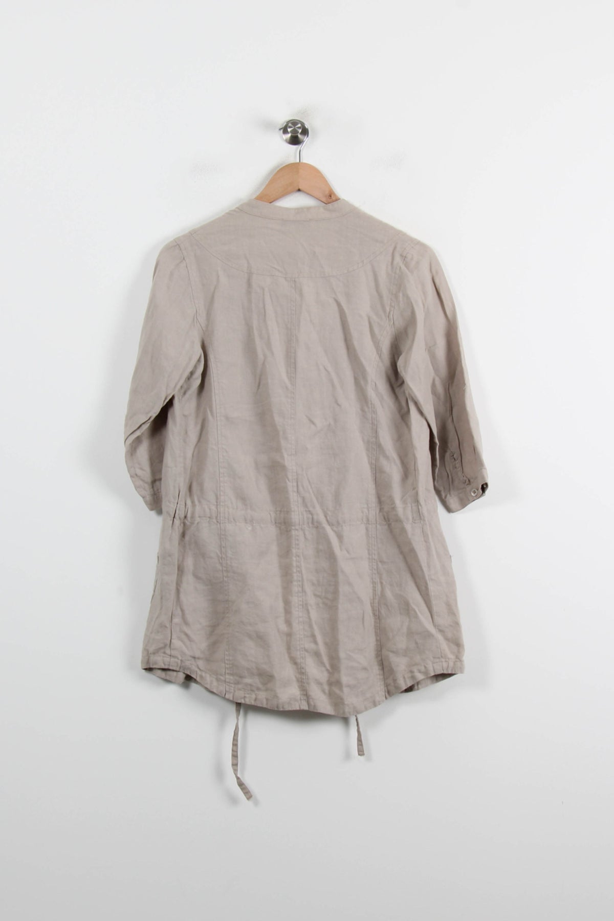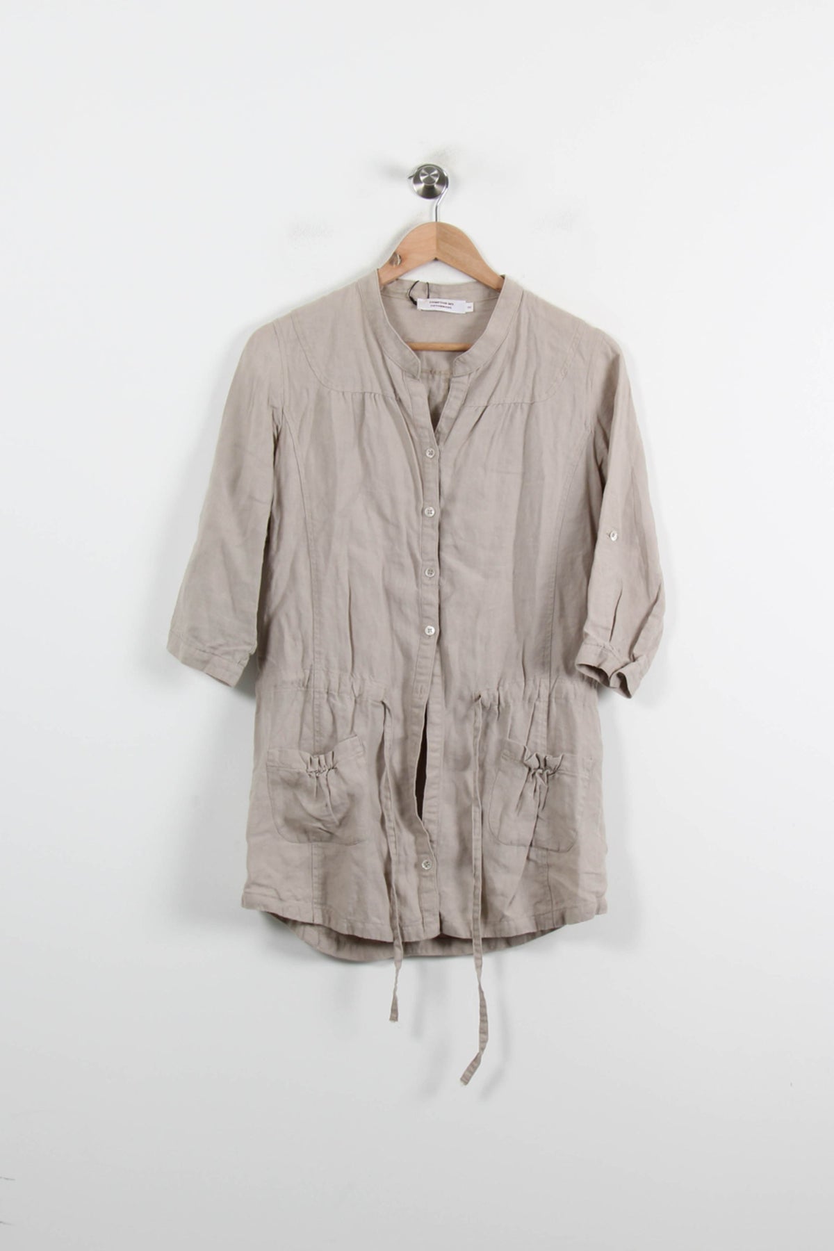 Veste beige Comptoir des Cotonniers, taille S/36, au style casual et raffiné. Confectionnée dans une matière fluide, cette veste se distingue par sa coupe droite, ses manches 3/4 retroussables, sa taille ajustable par lien, ses poches à détails froncés et ses boutons discrets. Idéale pour accompagner une tenue décontractée lors d’un après-midi printanier en ville.