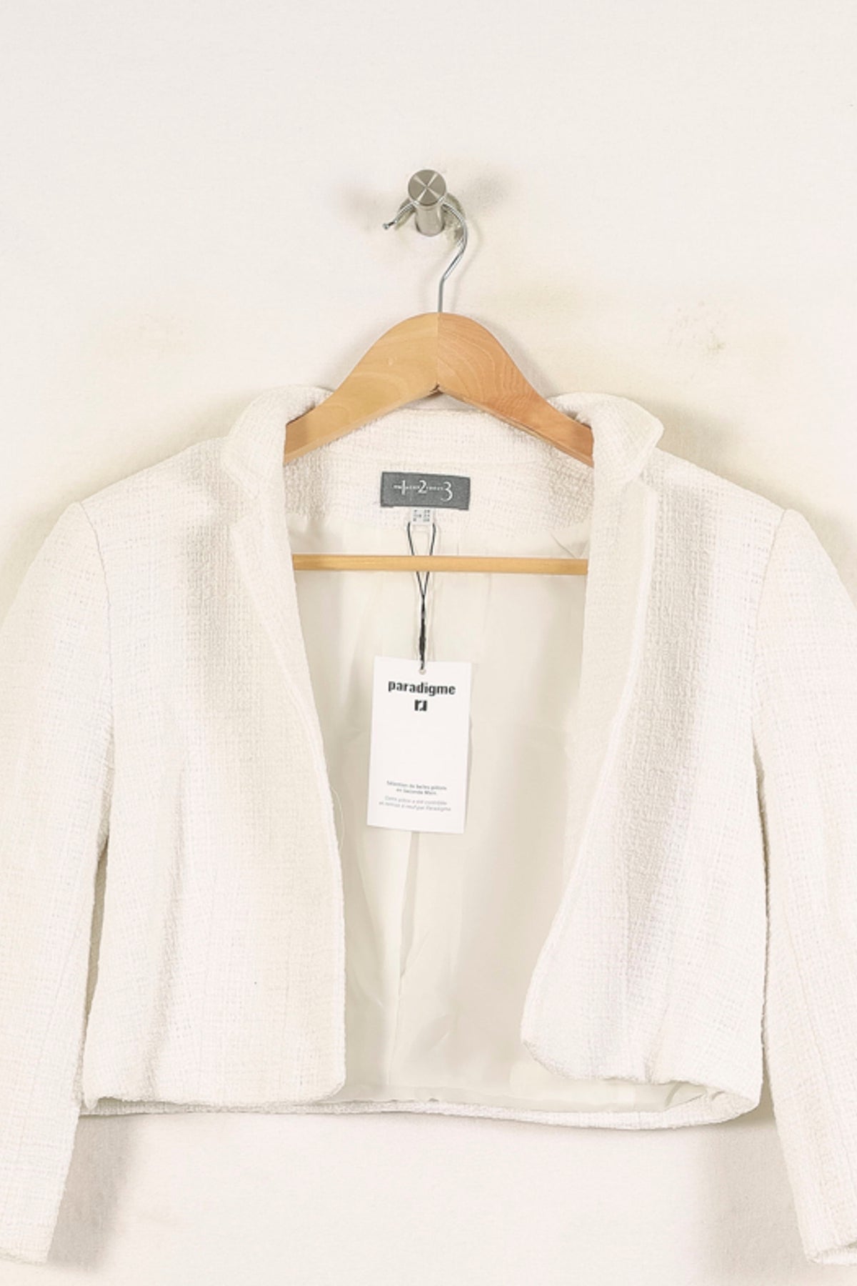 Veste courte blanche Maison 123 en taille S/36, élégante et raffinée, idéale pour compléter une silhouette chic. Confectionnée dans une matière texturée façon tweed, elle se distingue par ses finitions impeccables et son col structuré qui lui apportent une touche sophistiquée et intemporelle. Parfaite pour une cérémonie, une réunion professionnelle ou une soirée habillée.