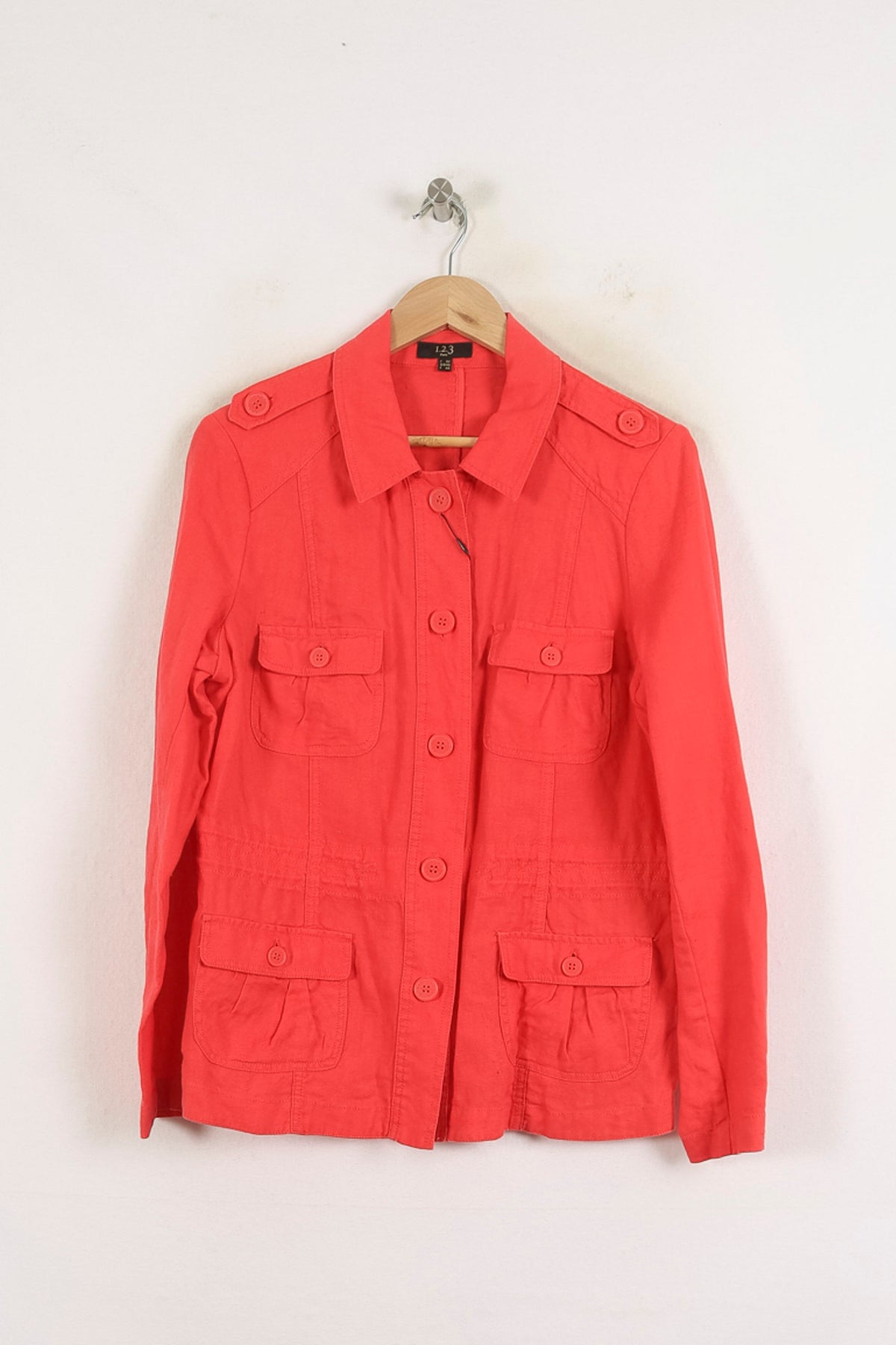 Veste rouge XL/42 Maison 123 – Élégante veste à manches longues, dotée de boutons apparents et de poches à rabat, idéale pour la mi-saison. Confectionnée dans une matière légère au toucher doux, elle se distingue par ses épaulettes boutonnées et ses surpiqûres structurantes qui apportent une touche raffinée et contemporaine. Parfaite pour compléter une tenue de bureau ou pour apporter une note chic à une sortie citadine.