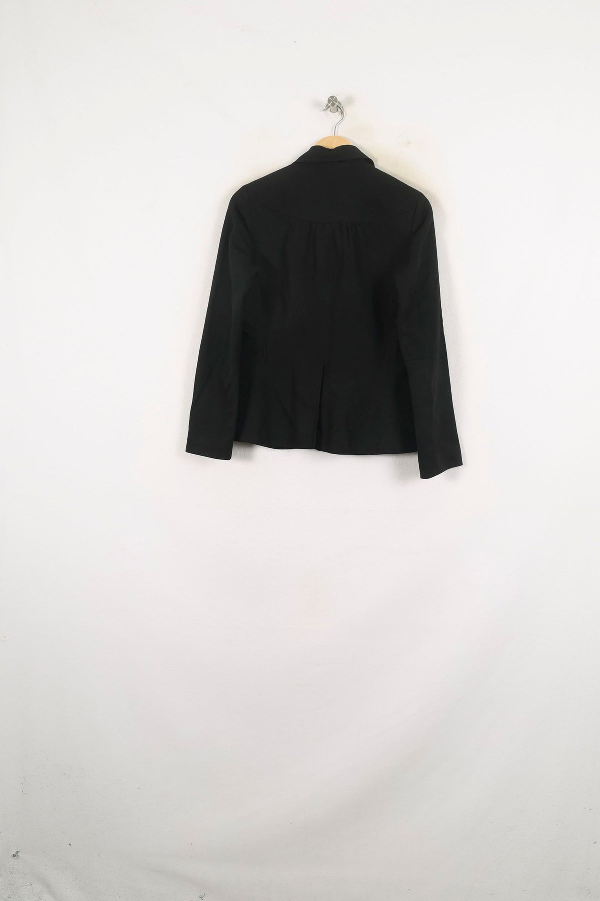 Veste noire Comptoir des Cotonniers, taille M/38, alliant élégance classique et simplicité pour compléter toutes vos tenues. Conçue dans une matière douce au toucher, elle présente une coupe droite et épurée, des boutons apparents à l’avant et un col soigné, détails qui lui confèrent une allure intemporelle et raffinée. Idéale pour accompagner une journée au bureau, ou pour sublimer une tenue lors d’un dîner en ville.