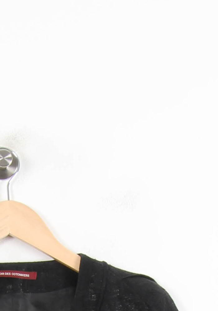 Veste noire Comptoir des Cotonniers, taille M/38, au style épuré et contemporain. Sa matière présente un effet texturé légèrement brillant, avec une coupe structurée, des poches plaquées et une encolure ronde sans col, lui conférant une allure sophistiquée et intemporelle. Idéale pour accompagner une tenue professionnelle ou sublimer un look de soirée chic.