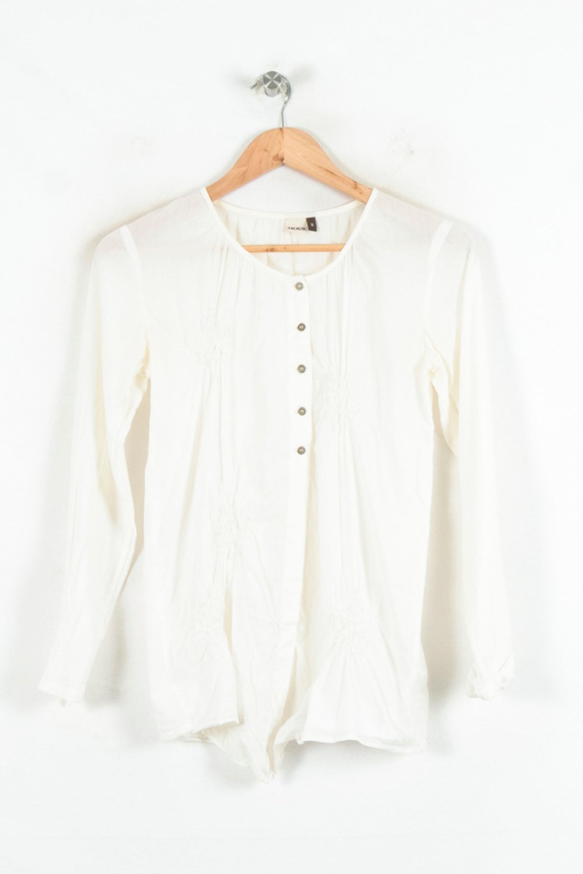 Blouse beige à manches longues IKKS, taille S/36, un top élégant et intemporel parfait pour sublimer toutes les silhouettes. Confectionné dans une matière fluide et légère, ce modèle se distingue par ses détails de fronces discrètes et ses boutons effet nacre sur le devant, lui apportant raffinement et originalité. À porter idéalement lors d’un déjeuner entre amis ou au bureau pour une allure chic et effortless.