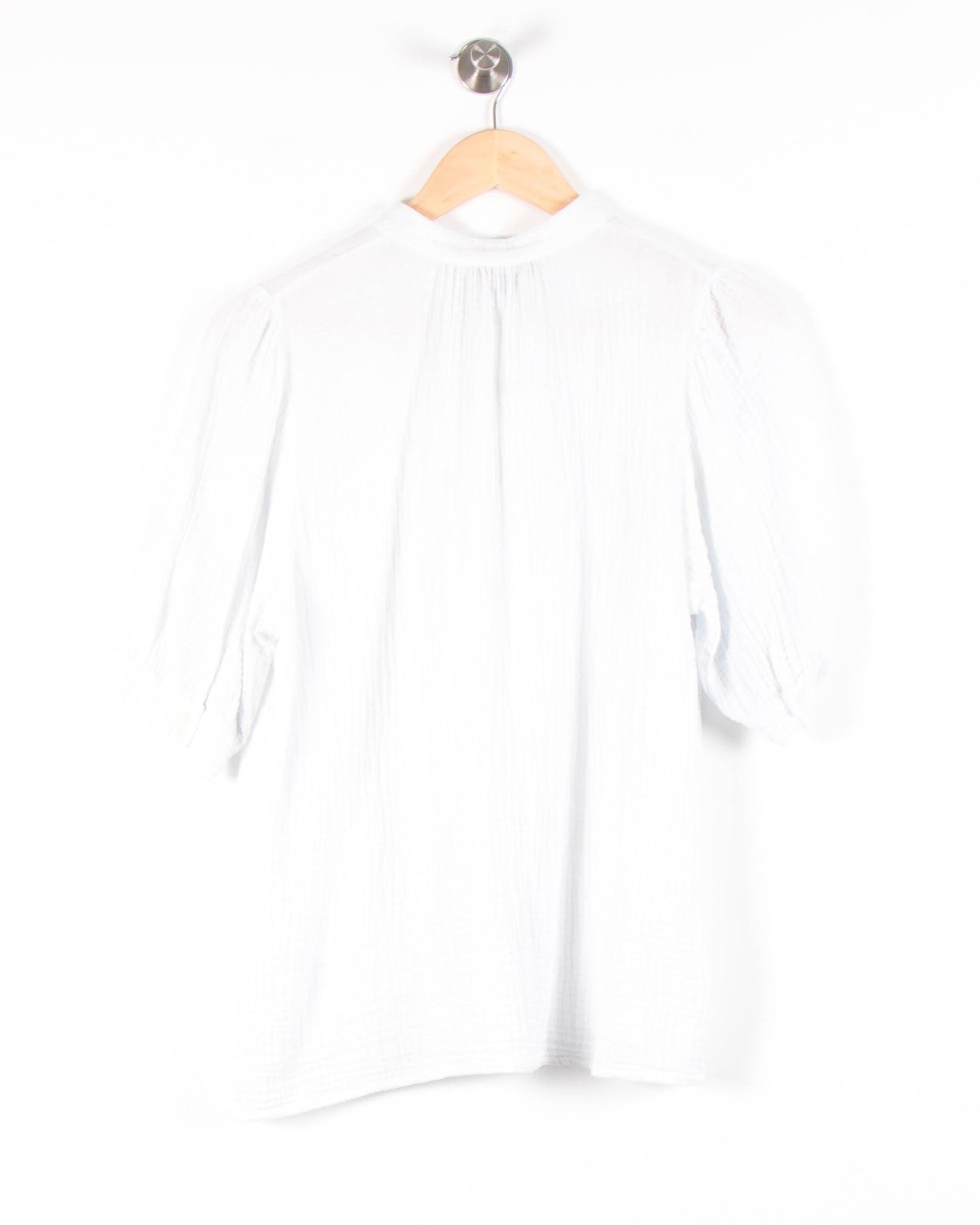 Top blanc Caroll, taille L/40 : ce haut raffiné se distingue par sa coupe droite et son coloris éclatant, signé par la marque Caroll. Confectionné dans une matière à effet légèrement texturé, il présente des manches trois-quarts bouffantes et des plis délicats à l'encolure, apportant une touche d'élégance discrète et de distinction au vêtement. Idéal pour une journée professionnelle ou un déjeuner en ville, il s'accorde facilement avec un pantalon classique ou une jupe.