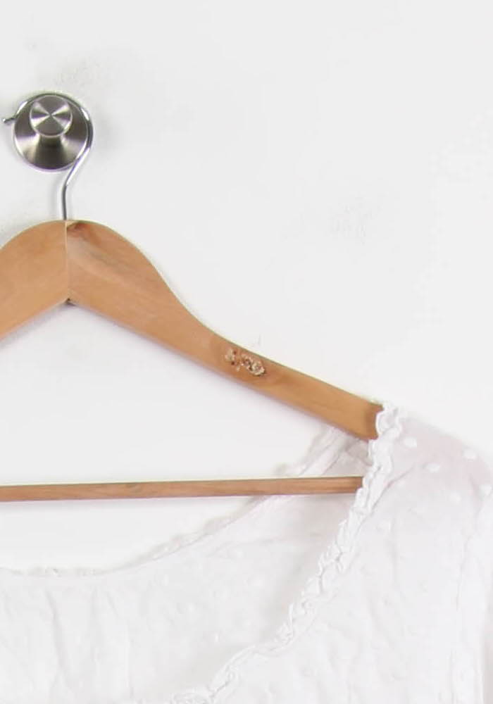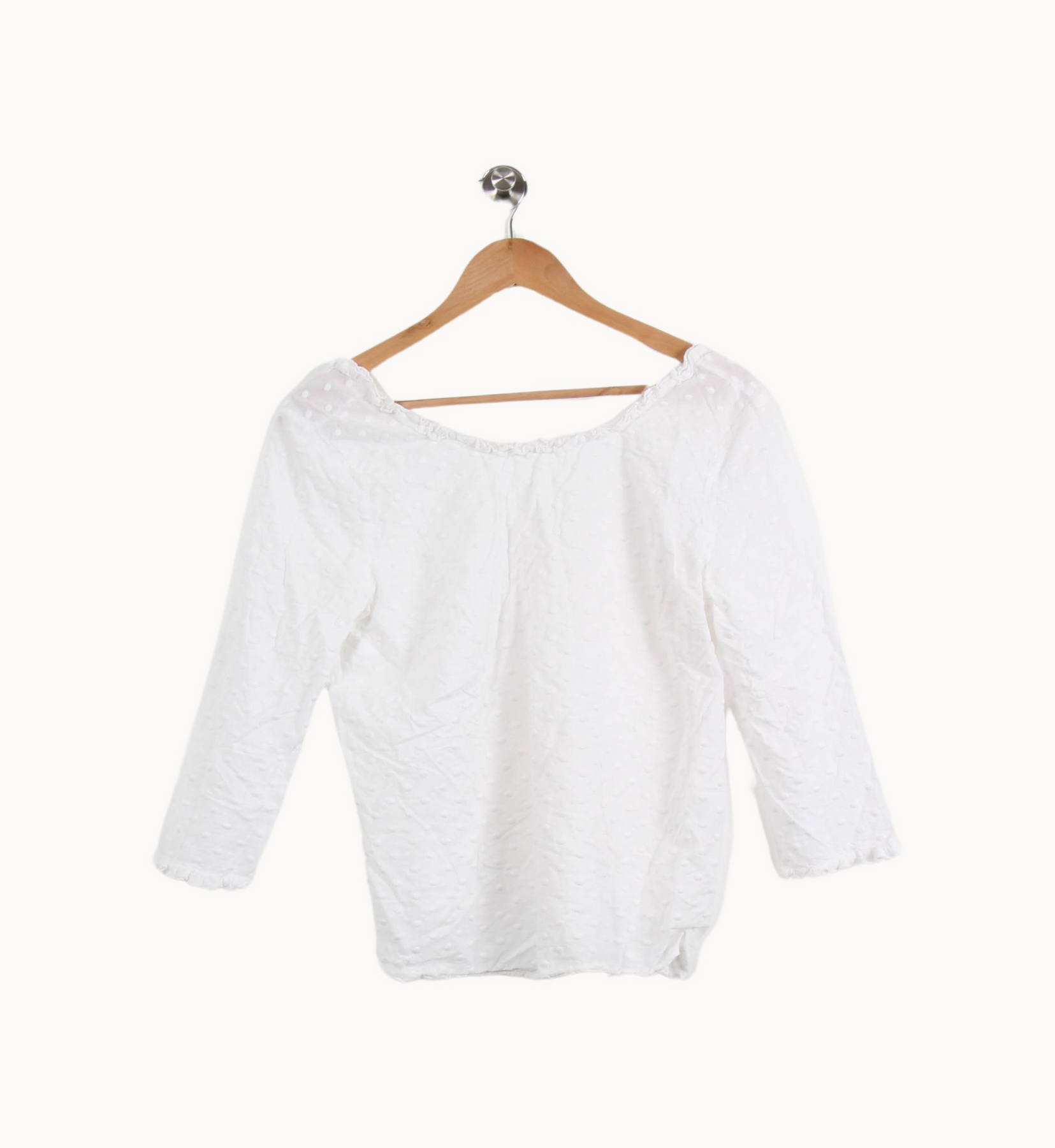 Top blanc Sézane, taille M/38 – Élégant haut à manches longues en tissu léger, idéal pour une allure raffinée au quotidien. La matière légèrement texturée à pois apporte originalité et douceur, tandis que le décolleté arrondi orné d’un fin liseré délicat met en valeur la féminité du modèle. Ce top est parfait pour une journée de travail ou un déjeuner en terrasse.
