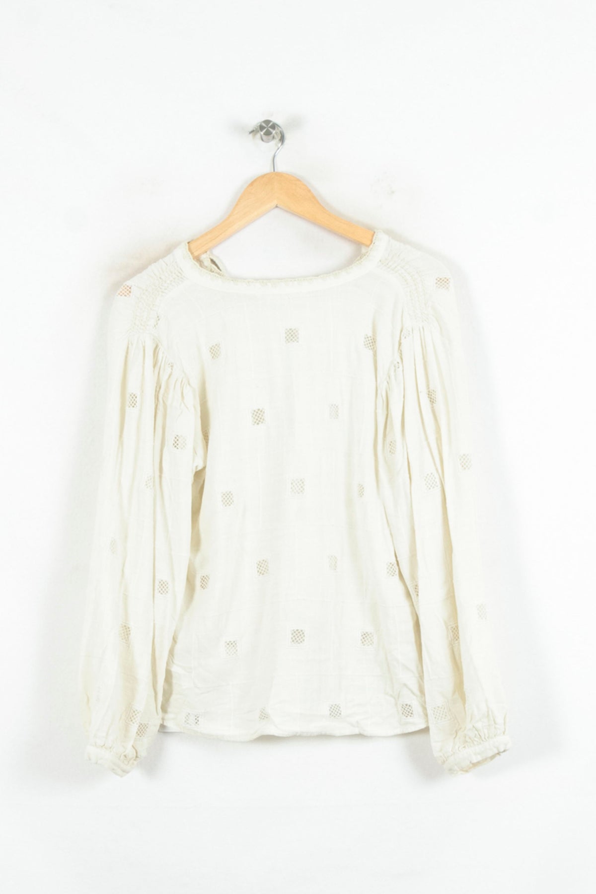 Blouse à pompons ba&sh, taille M/38, couleur blanche, au style décontracté et féminin. Confectionnée dans une matière légère ornée de délicats motifs ajourés et de finitions à pompons, cette pièce se distingue par ses détails raffinés et sa coupe ample confortable. Idéale pour une journée estivale, un déjeuner entre amis ou un week-end à la campagne.