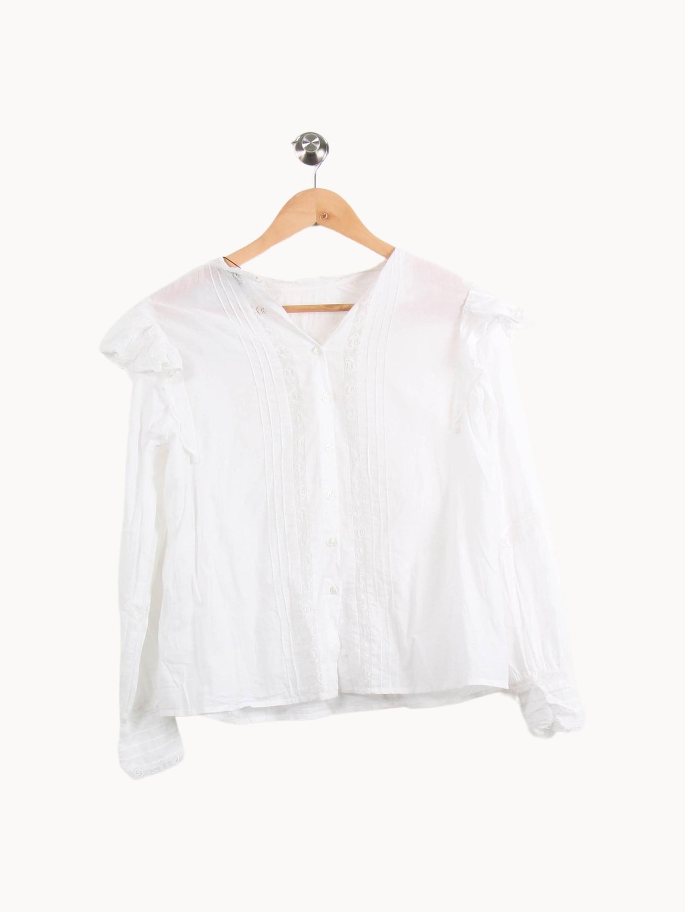Blouse blanche Petite Mendigote, taille XS/34, à manches longues et à boutons, élégante et raffinée, idéale comme top intemporel. Confectionnée dans une matière légère à l’aspect fluide, elle se distingue par ses délicats plis sur le devant et ses détails volantés aux épaules, lui conférant une touche féminine et sophistiquée. Parfaite pour une journée de travail accessoirisée de bijoux fins, ou pour une sortie élégante en ville.