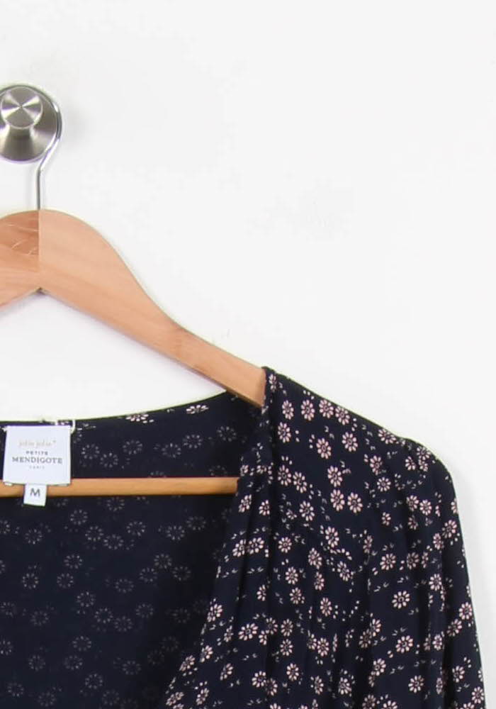 Top multicolore Petite Mendigote taille M/38, avec un motif fleuri délicat sur fond foncé, manches longues et encolure en V. Confectionné dans une matière légère et fluide, ce haut se distingue par son imprimé finement travaillé et ses jolis détails froncés au niveau de la poitrine, soulignant la féminité de la silhouette. Parfait pour une journée au bureau ou une sortie décontractée en ville, accompagné d'un pantalon élégant ou d'un jean.
