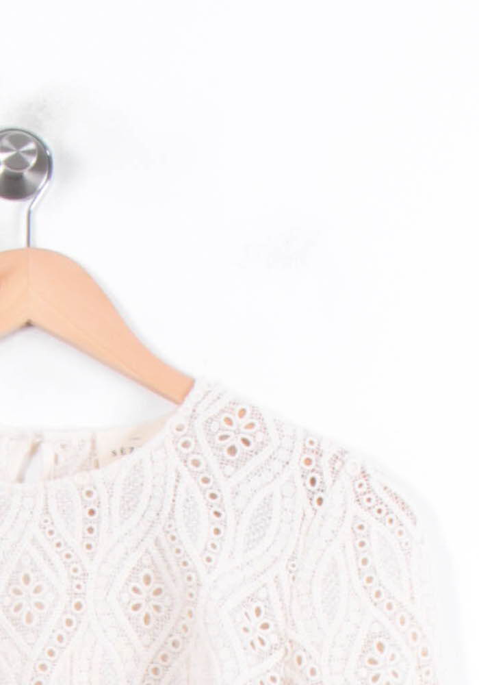 Top en dentelle brodée Sézane, beige, taille S/36 – Élégant et raffiné, ce modèle incarne parfaitement l’esprit de la marque. Sa matière ajourée révèle un motif floral délicat et des jeux de transparence, mettant en valeur des finitions soignées au niveau des poignets et du col rond pour une allure intemporelle. Idéal pour une occasion spéciale ou un déjeuner en ville, porté avec un pantalon taille haute et des accessoires dorés.
