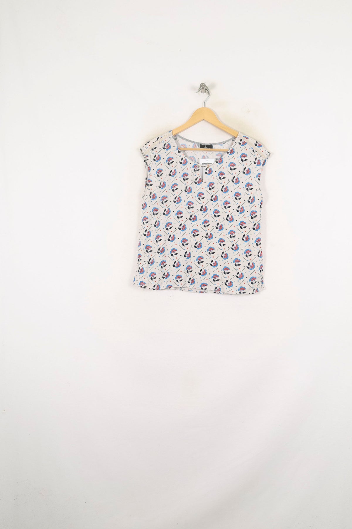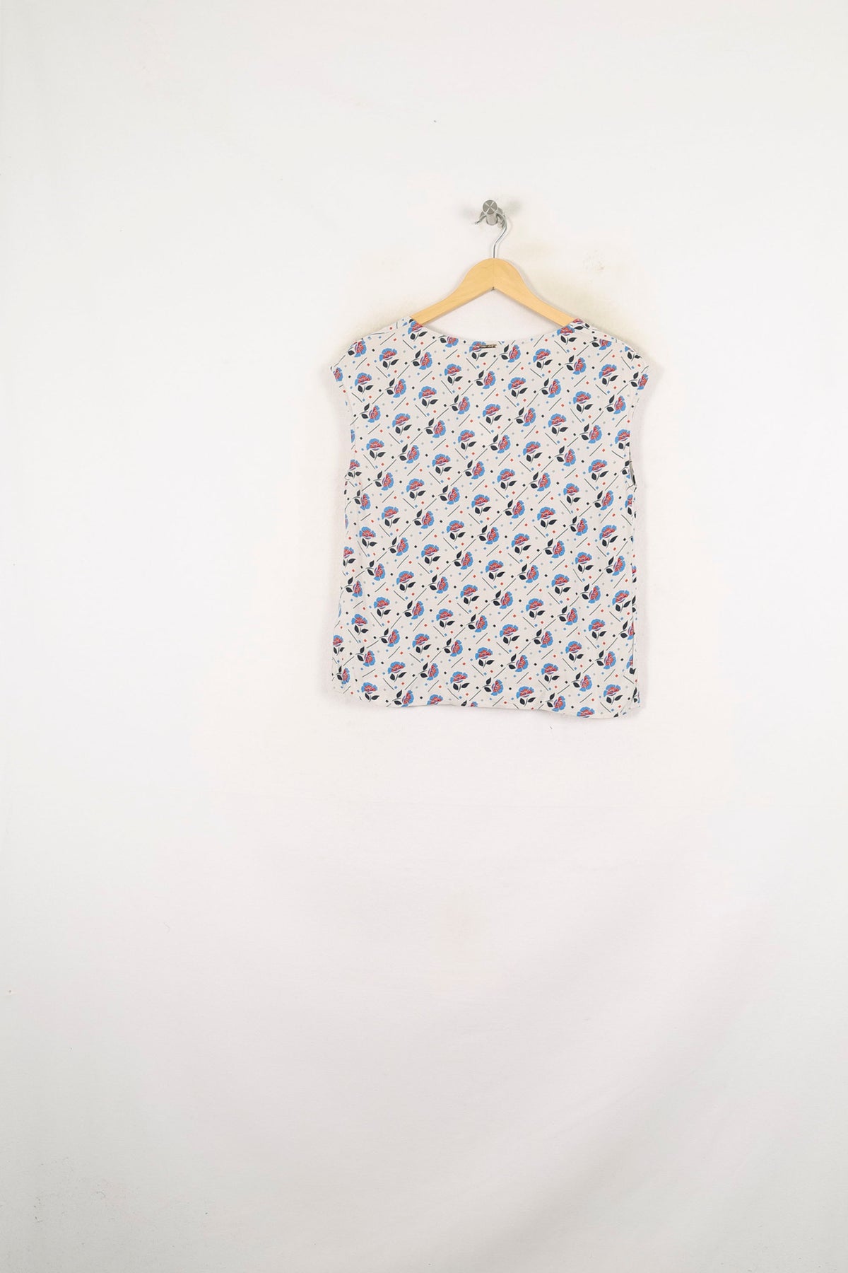 Top multicolore sans manches One Step taille M/38, au motif graphique délicat et coloré, idéal pour dynamiser une tenue estivale. Confectionné dans une matière légère et fluide, ce haut se distingue par son imprimé original et une petite encolure fendue qui lui confèrent un esprit moderne et raffiné. Parfait pour une journée décontractée au bureau ou un déjeuner en terrasse entre amis.