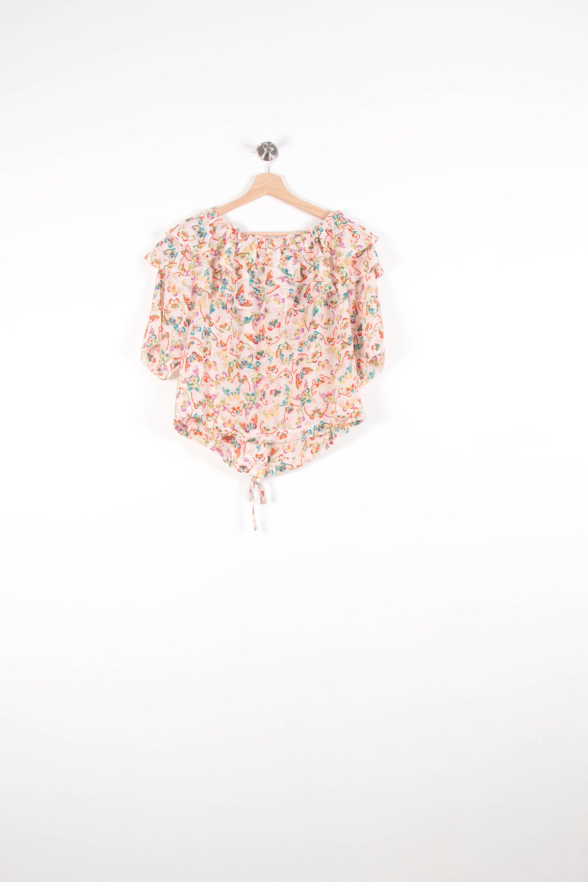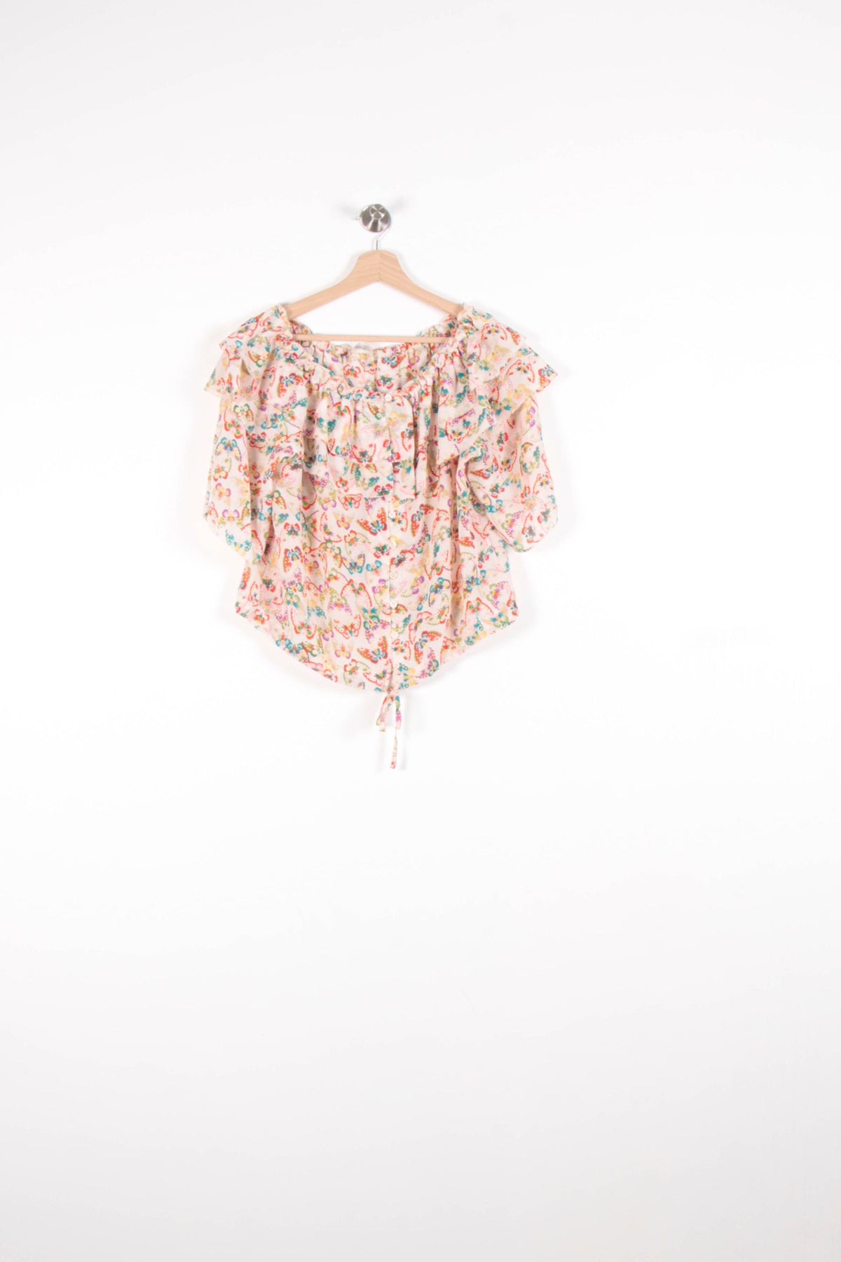 Top multicolore Zadig&Voltaire en taille S/36, arborant une coupe décontractée avec imprimé floral coloré. Confectionné dans une matière légère et fluide, ce haut se distingue par ses volants aux épaules, ses manches courtes et son lien à nouer à la taille, apportant une touche originale et raffinée. Parfait pour une sortie estivale ou un déjeuner en terrasse, il ajoutera une note fraîche et féminine à votre tenue.