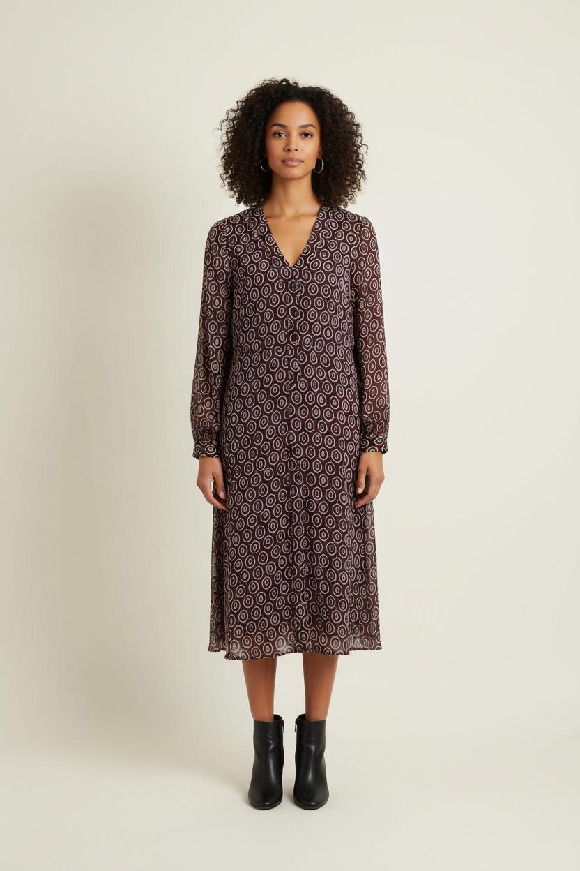 Robe IKKS multicolore, taille XL/42, affichant un élégant motif géométrique pour une allure moderne et tendance. Confectionnée dans une matière légère et fluide, cette pièce se distingue par ses motifs hexagonaux et ses finitions soignées qui lui confèrent une touche unique. Parfaite pour une journée au bureau ou une sortie décontractée, cette robe apportera une note chic à votre garde-robe.