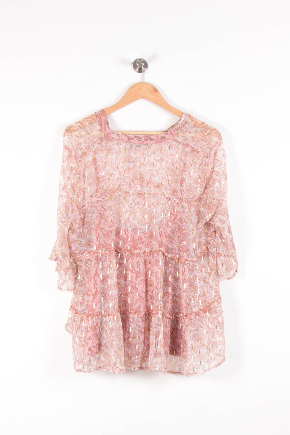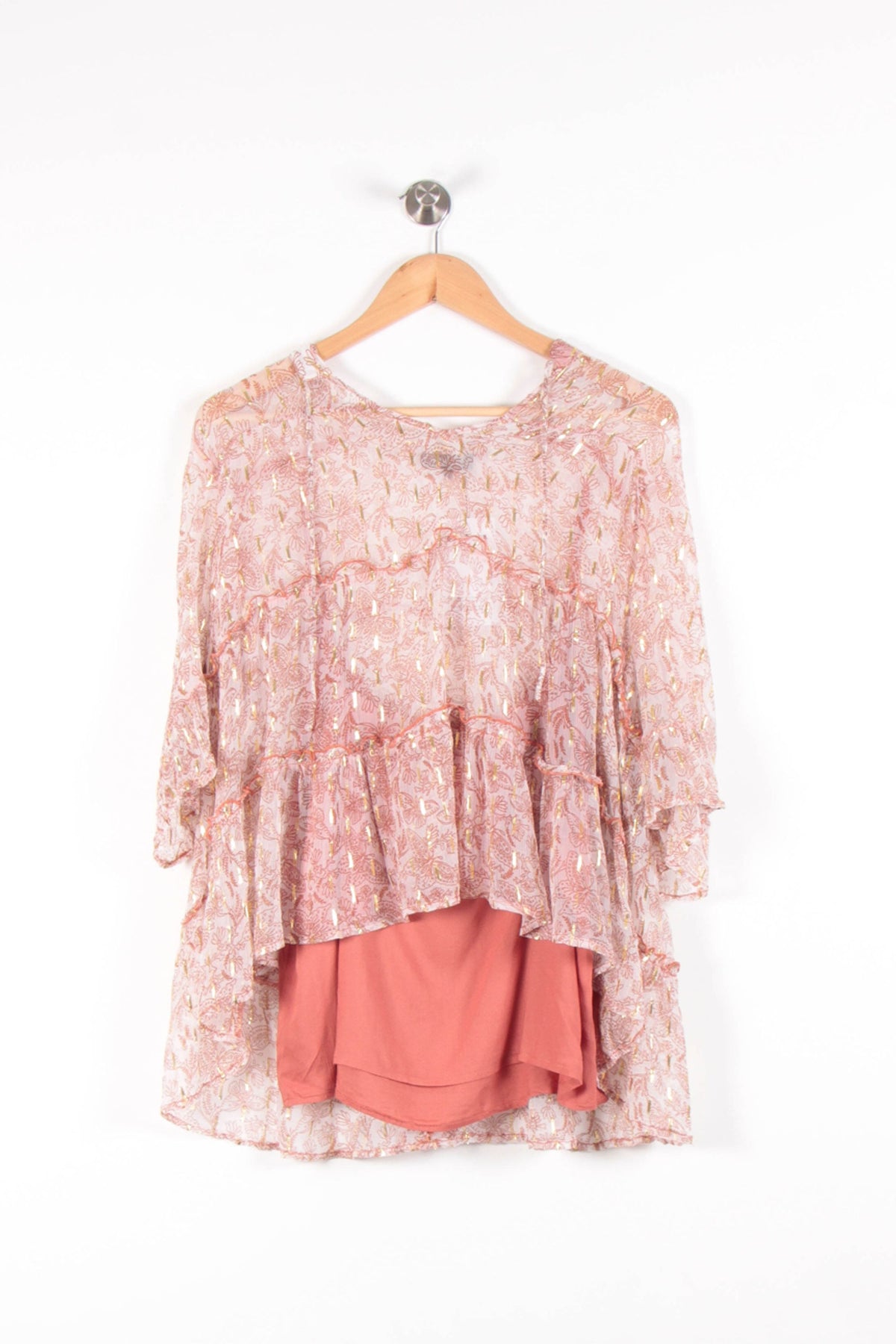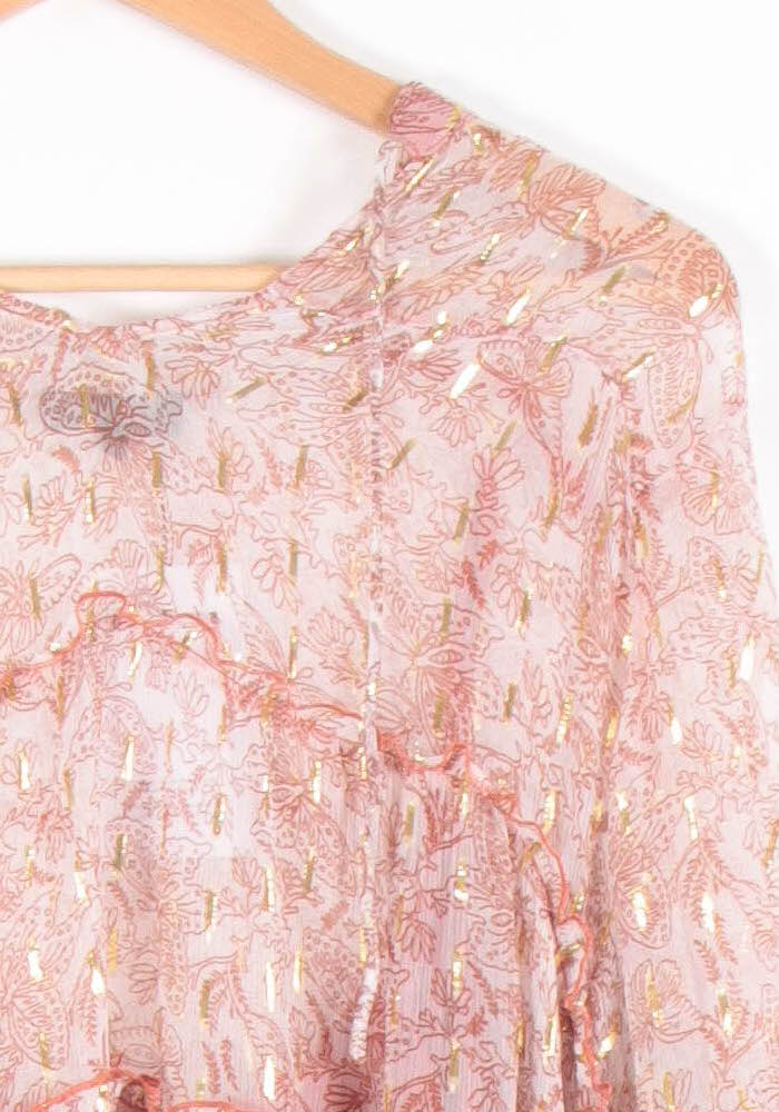 Top multicolore Caroll taille XL/42 – Ce haut élégant de la marque Caroll présente une coupe fluide et raffinée dans des tons variés pour un look féminin et sophistiqué. Confectionné dans une matière légère et vaporeuse, ce modèle se distingue par son tissu transparent à motifs dorés et sa doublure contrastante, ainsi que par ses volants délicats qui apportent mouvement et originalité. Idéal pour une réception estivale ou un dîner en terrasse.